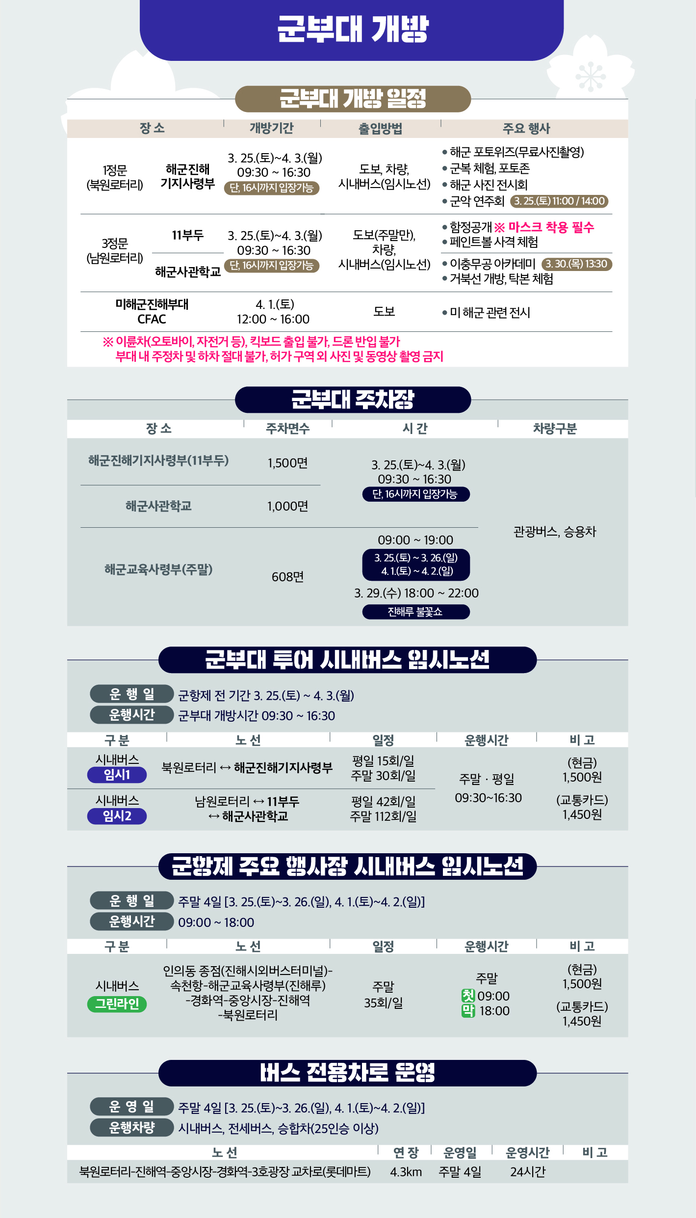 교통이 막힐것이 예상되며 진해군항제를 보러 오시는 분들은 무료 셔틀버스를 이용하시면 더욱 편리할것입니다.