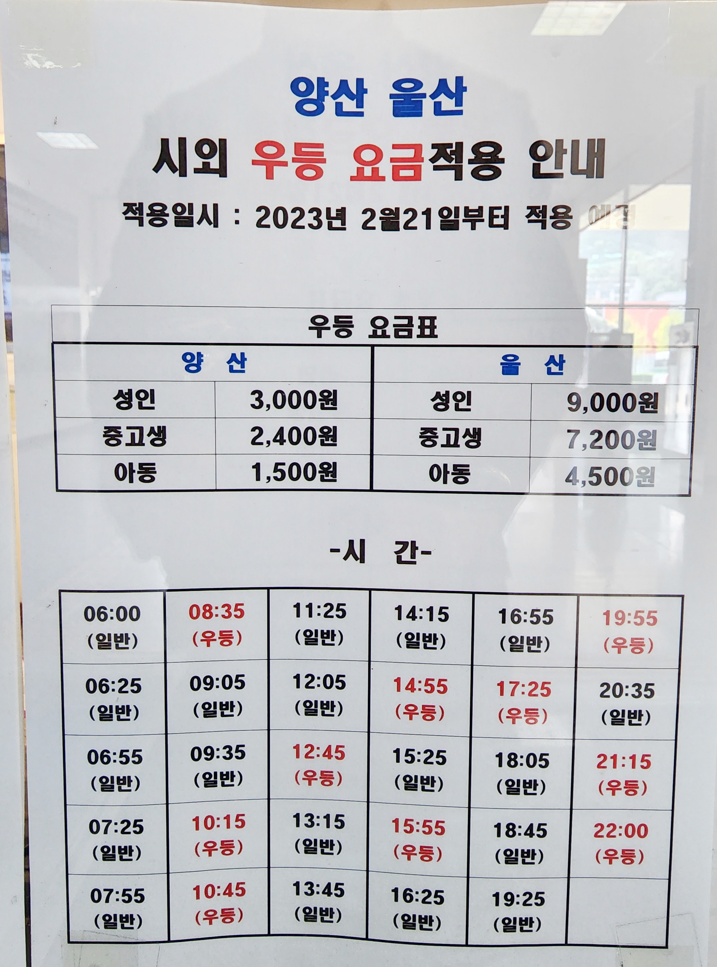 양산, 울산 우등 요금 적용.