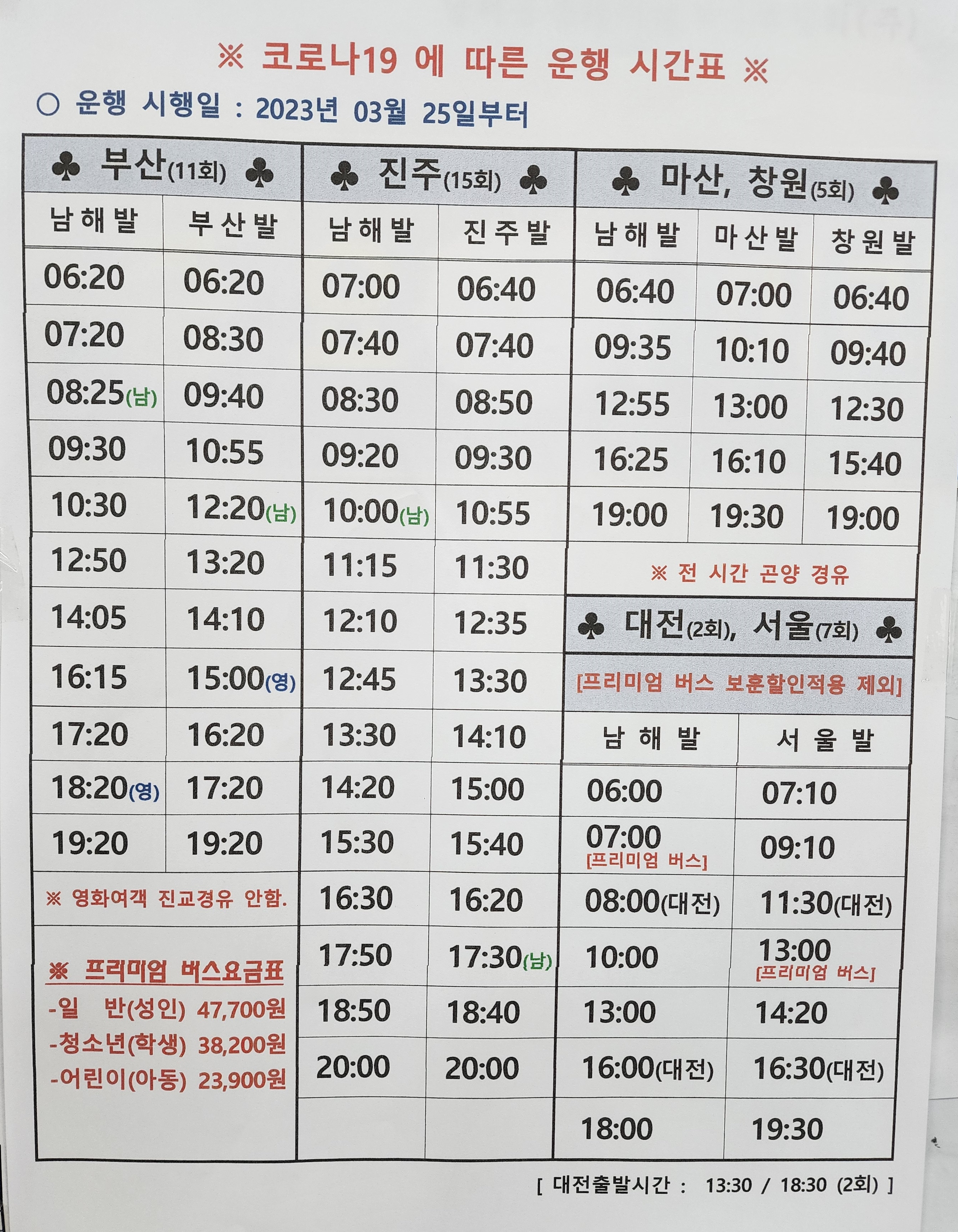 남해 출발 부산, 진주, 마산, 창원, 대전, 서울 방면.