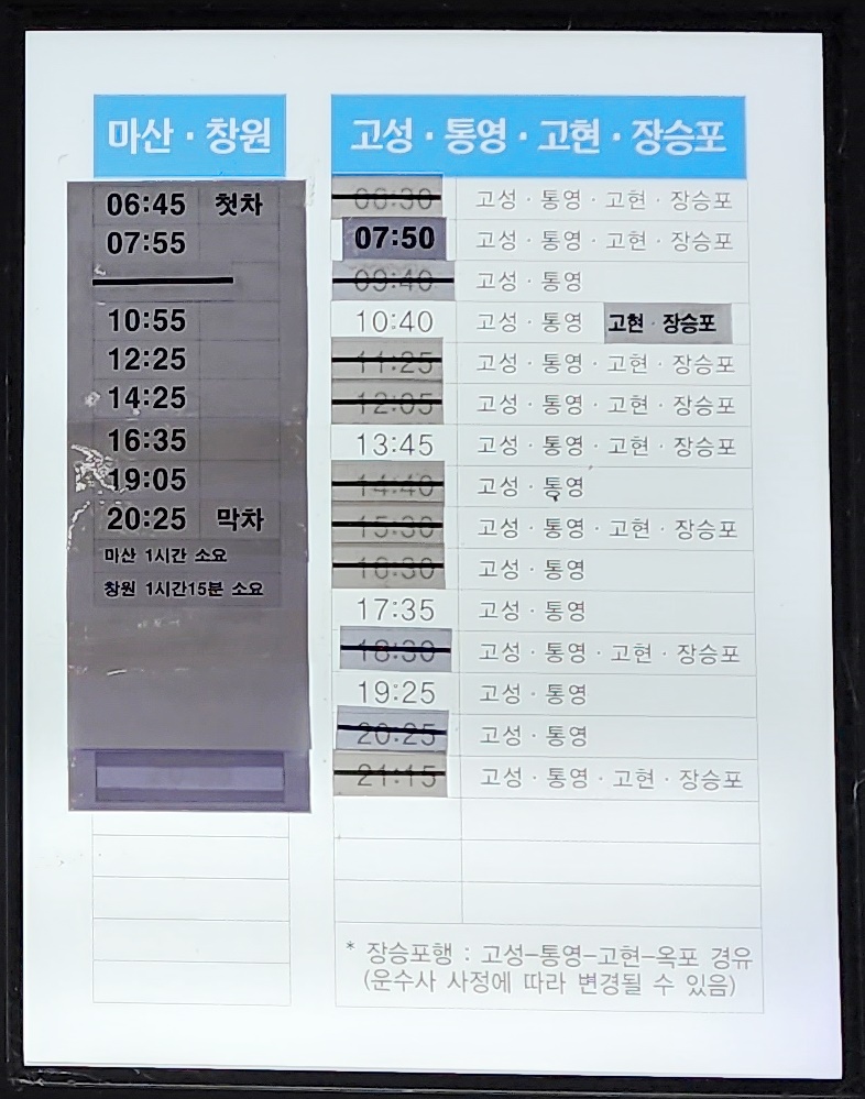 사천 출발 마산, 창원, 고성, 통영, 고현, 장승포 방면.
