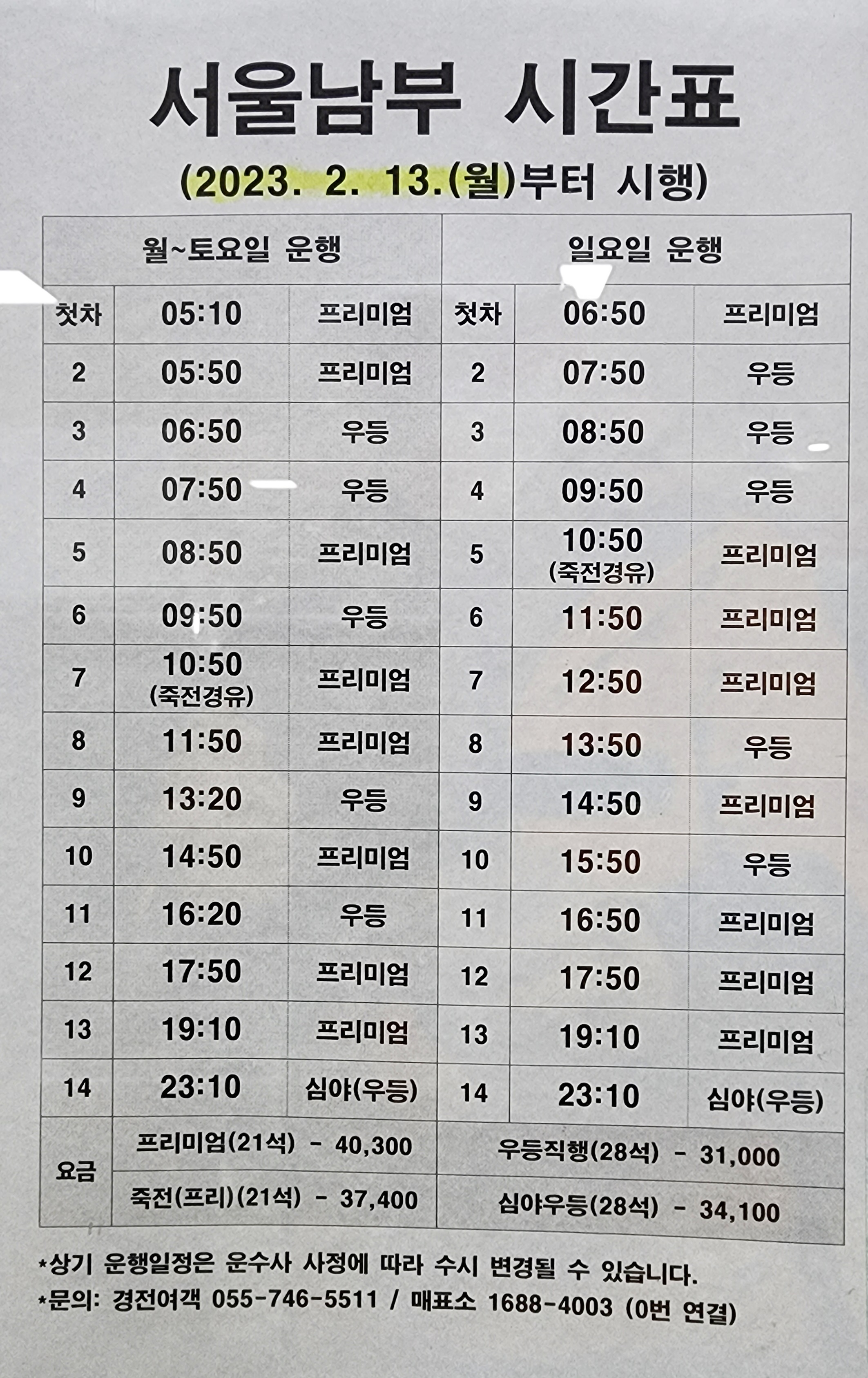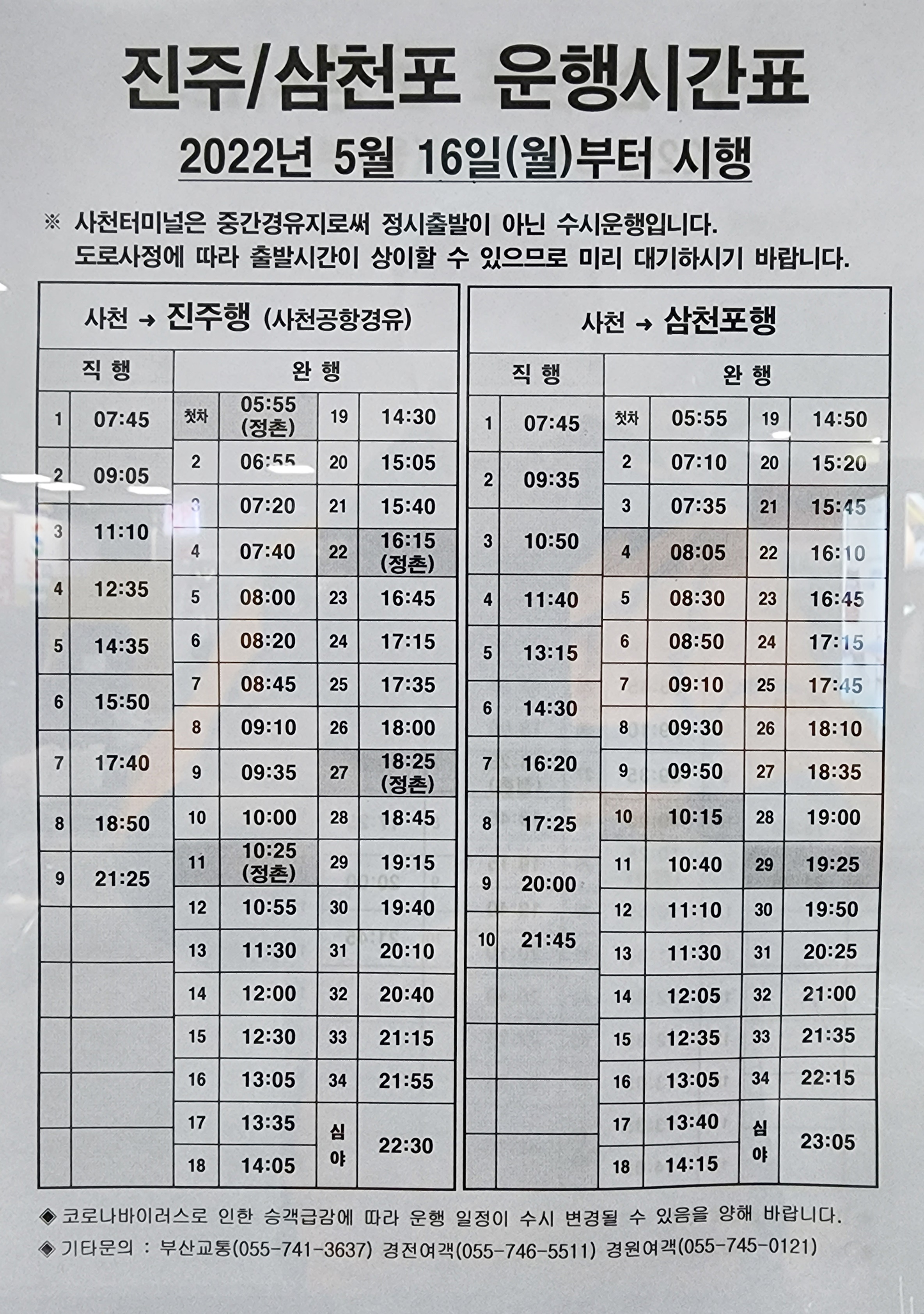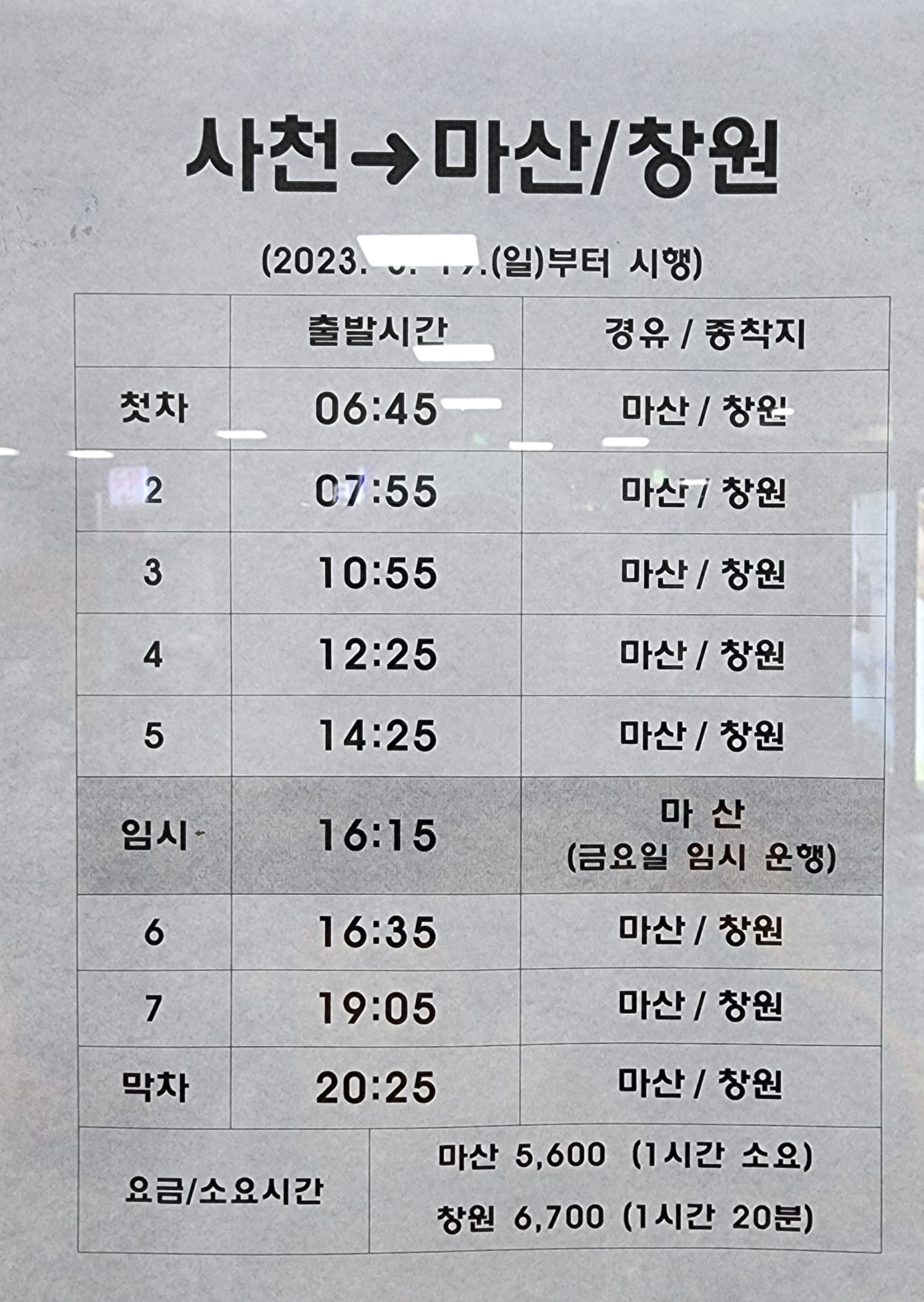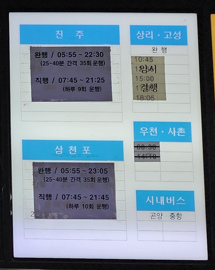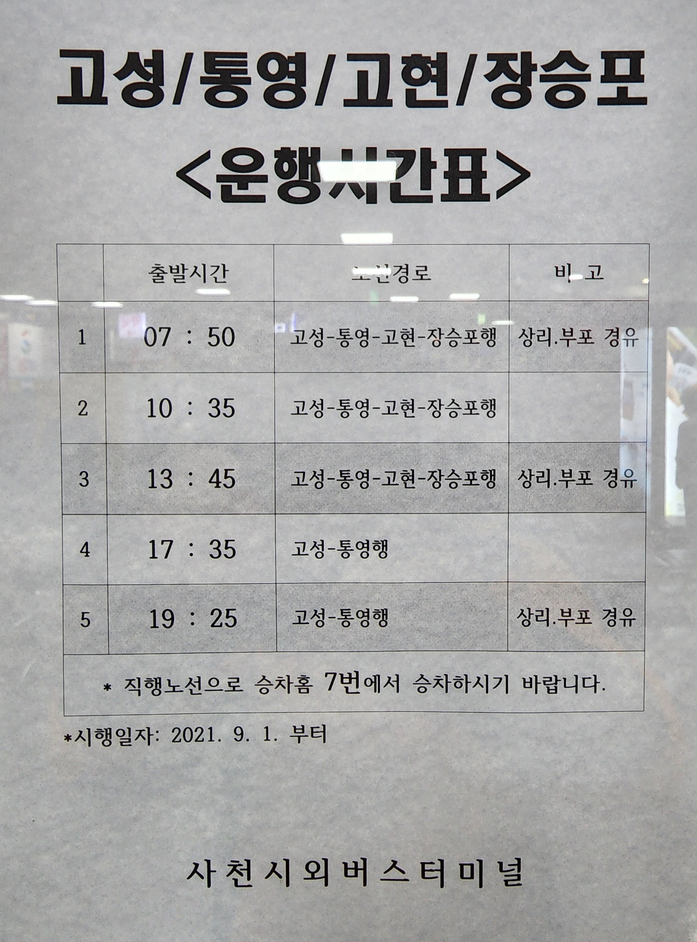 사천 출발 마산, 창원, 고성, 통영, 고현, 장승포 방면.