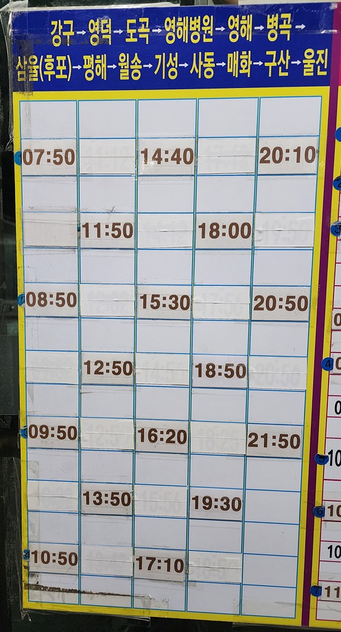 영덕 강구 출발 영덕, 도곡, 영해병원, 영해, 병곡, 삼율(후포), 평해, 월송, 기성, 사동, 매화, 구산, 울진 방면.
