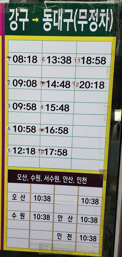 영덕 강구 출발 동대구, 오산, 수원, 서수원, 안산, 인천 방면.