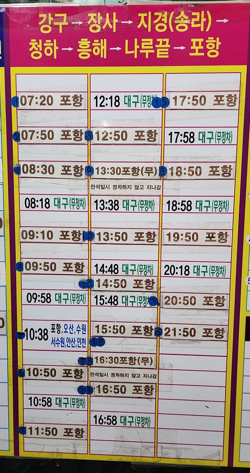 영덕 강구 출발 장사, 지경(송라), 청하, 흥해, 나루끝, 포항 방면.