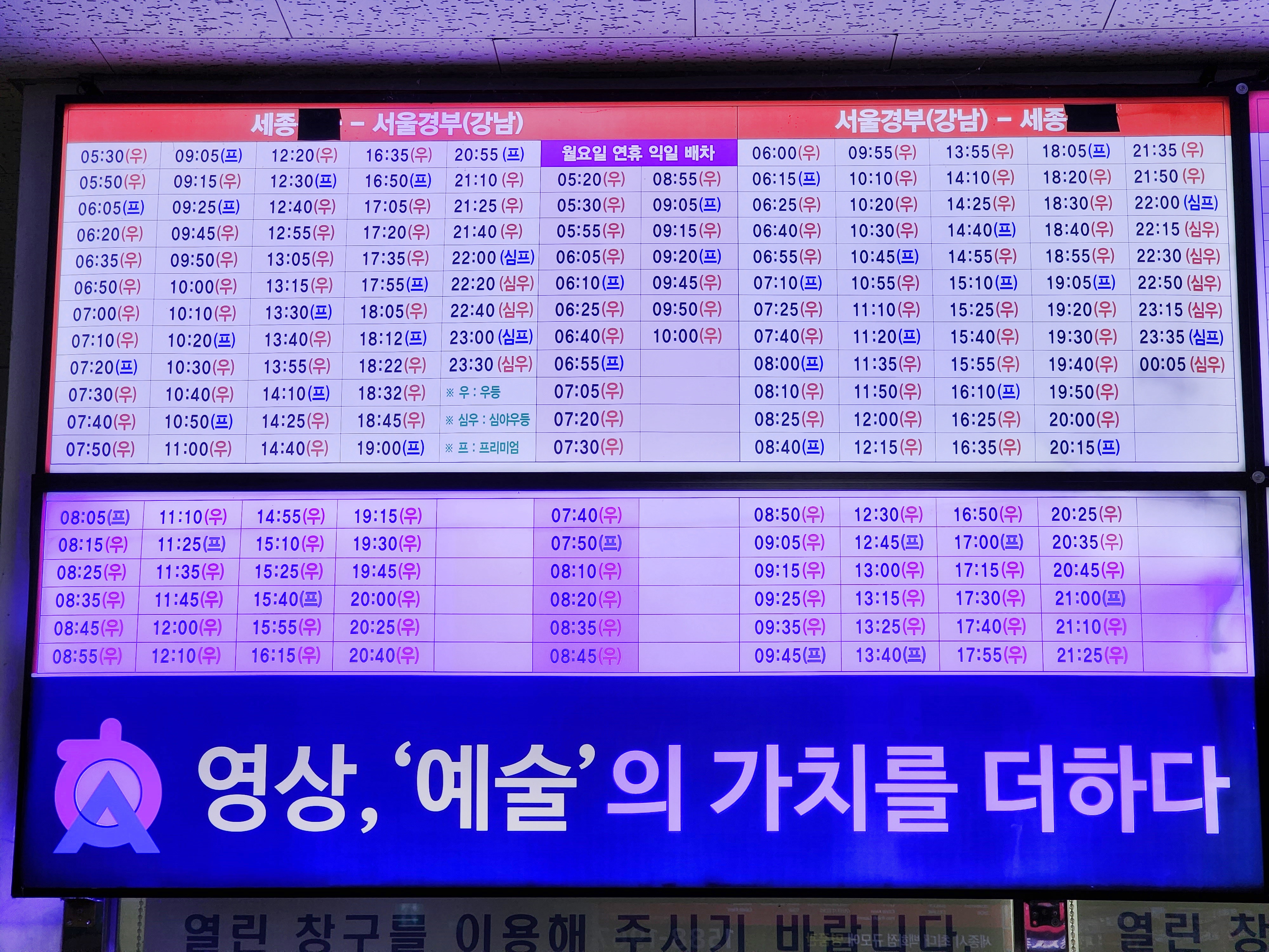 세종 출발 인천국제공항, 동서울, 서울남부, 오산, 수원, 성남, 분당, 양탑, 천안, 향남, 고양, 일산, 백석, 조치원, 청주, 자운대, 안양, 인천, 부천, 소풍, 안산, 경북도청, 안동, 구미, 동대구 방면.