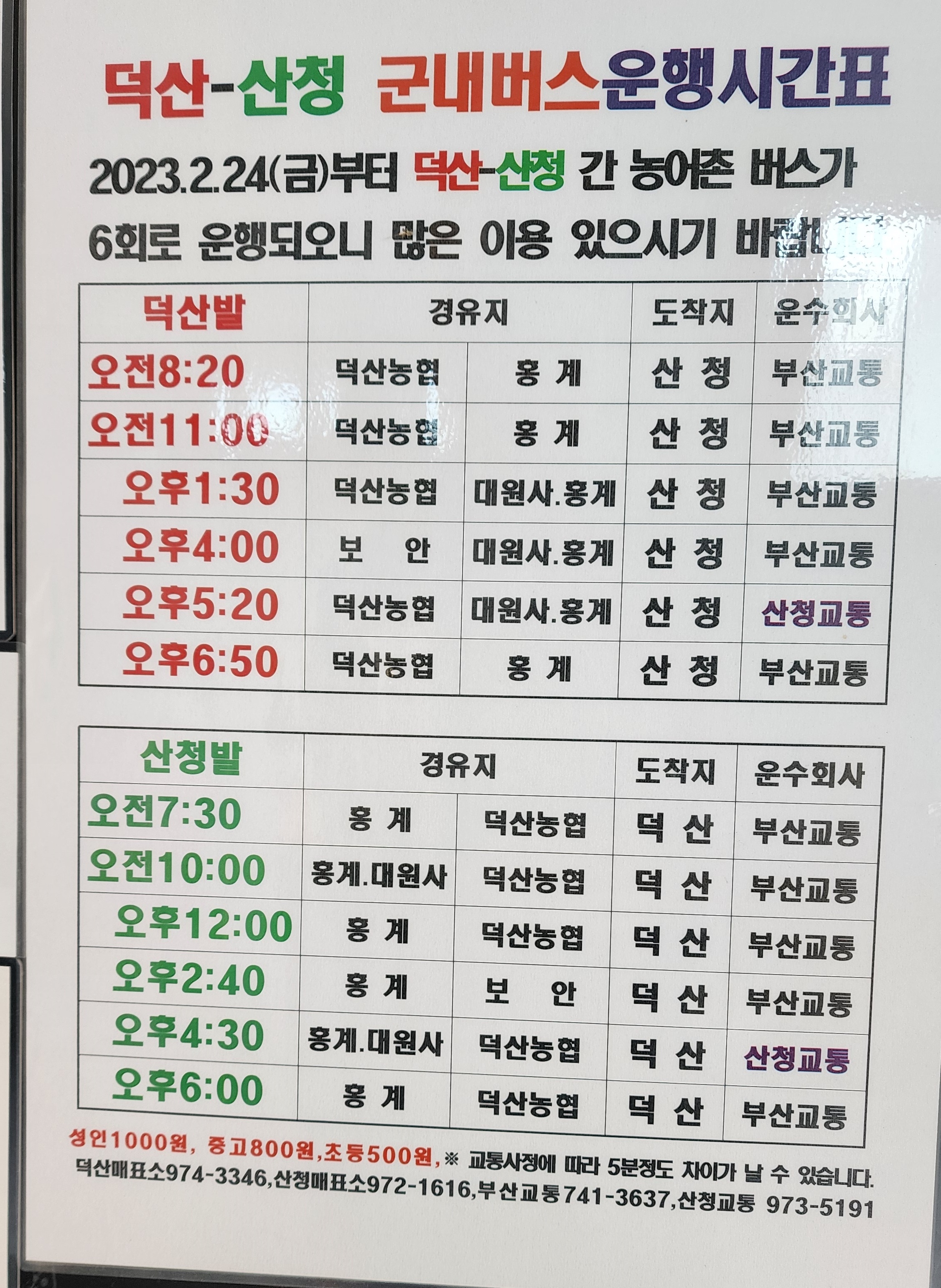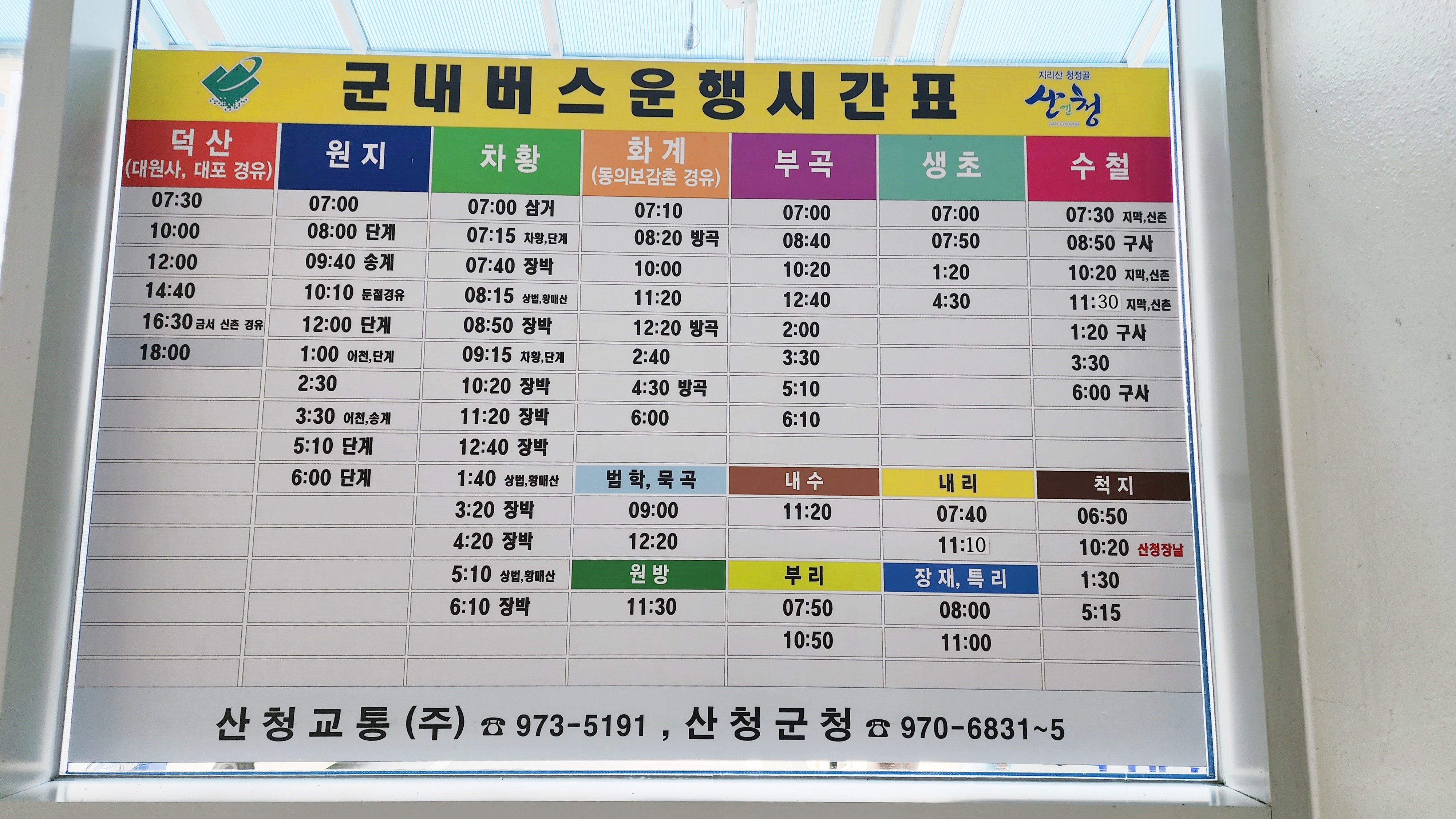 덕산, 원지, 차황, 화계, 부곡, 생초, 수철 방면.