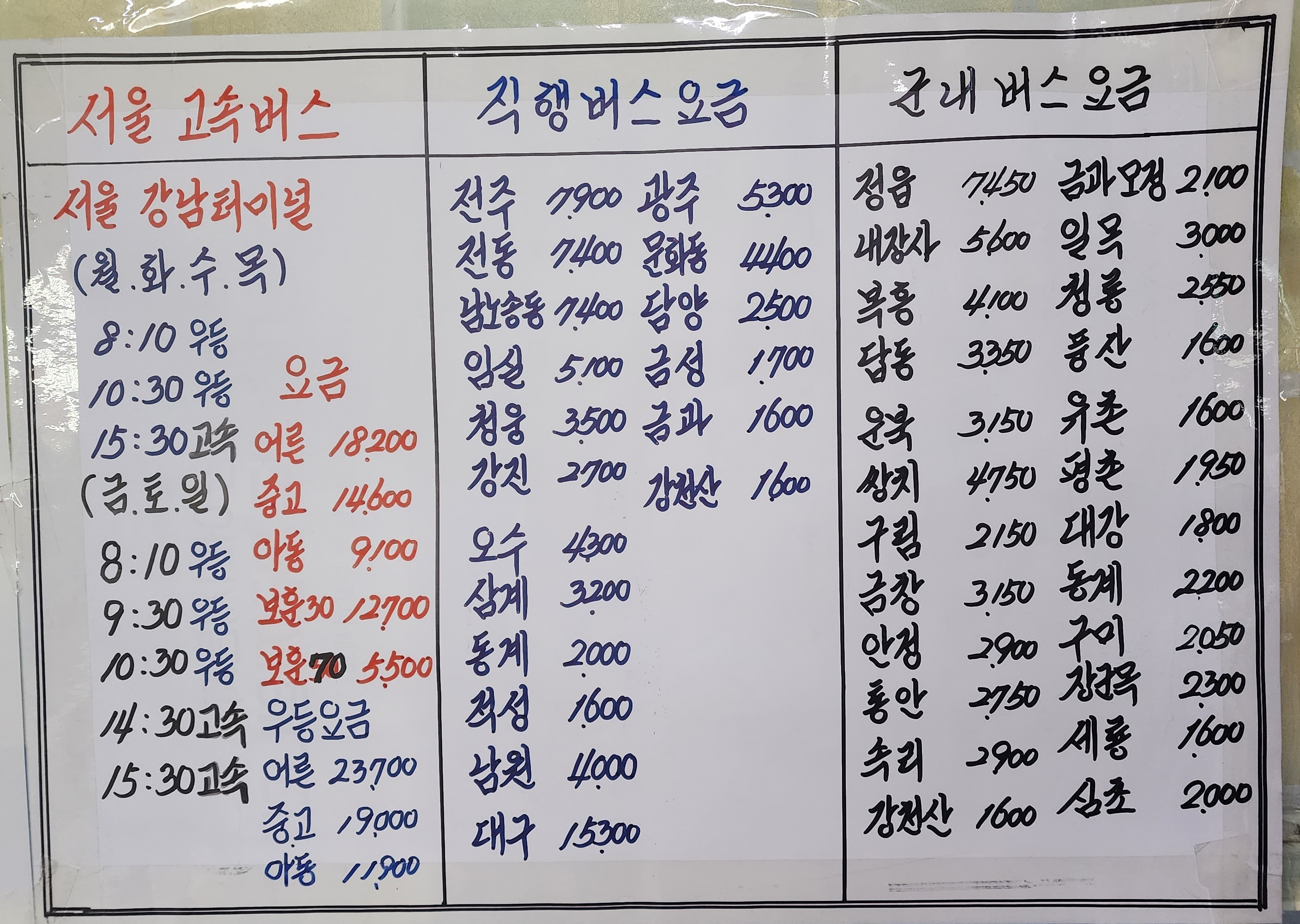 순창 출발 서울, 전주, 오수, 담양, 광주, 남원, 강천사 방면.