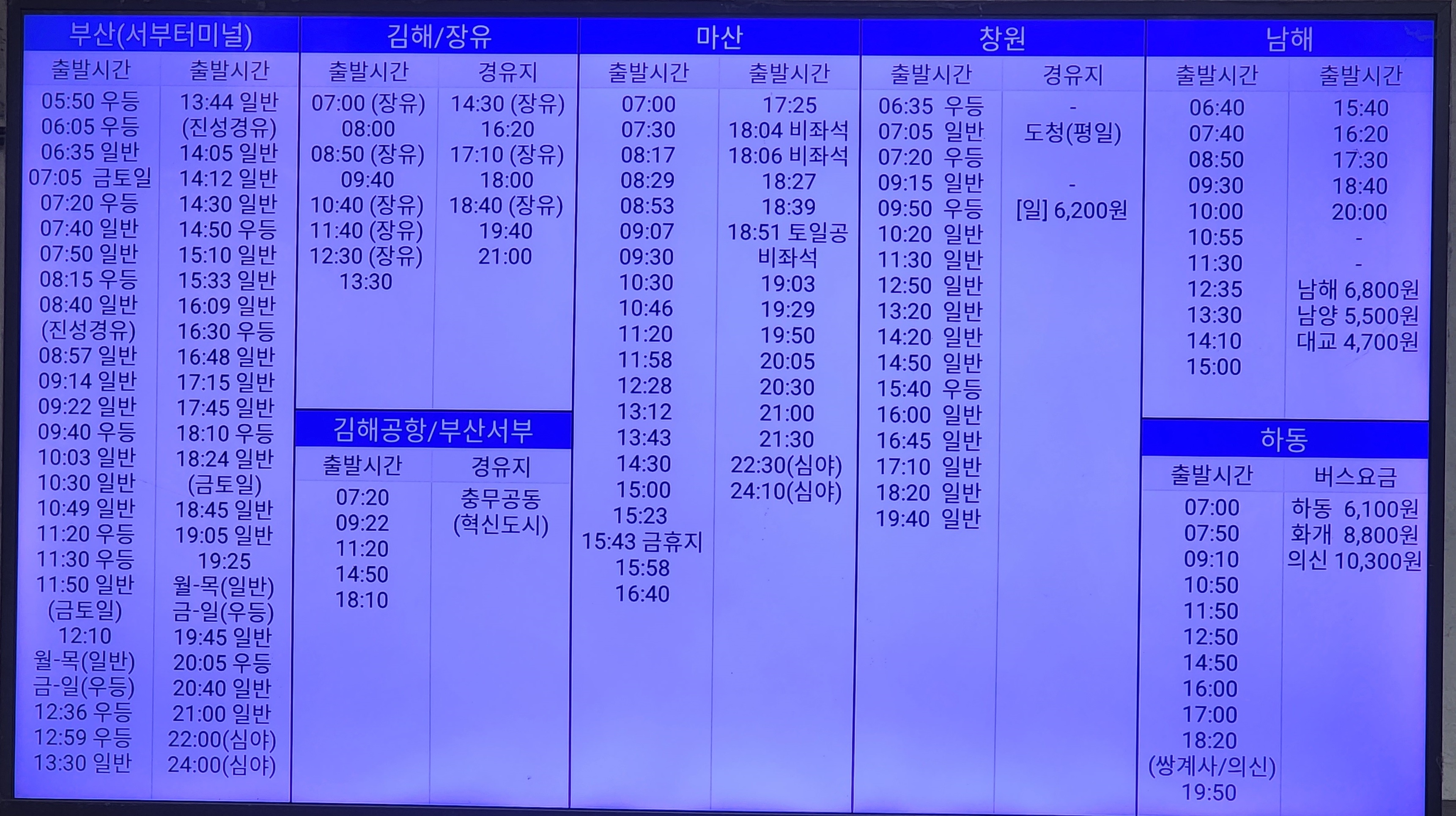 진주 출발 부산 사상, 김해, 장유, 김해공항, 마산, 창원, 남해, 하동 방면.