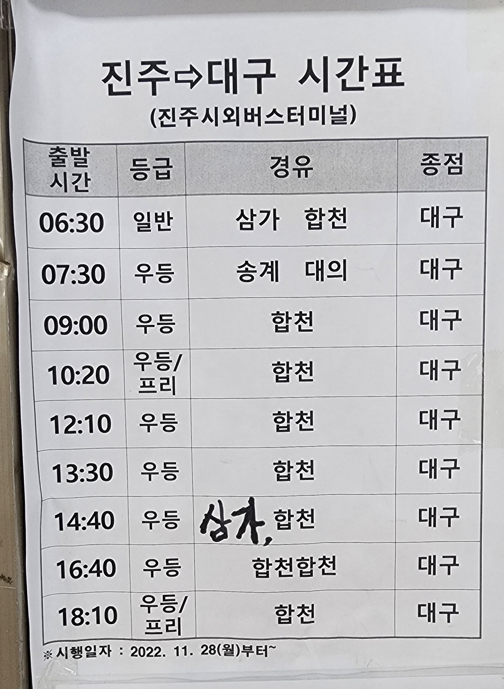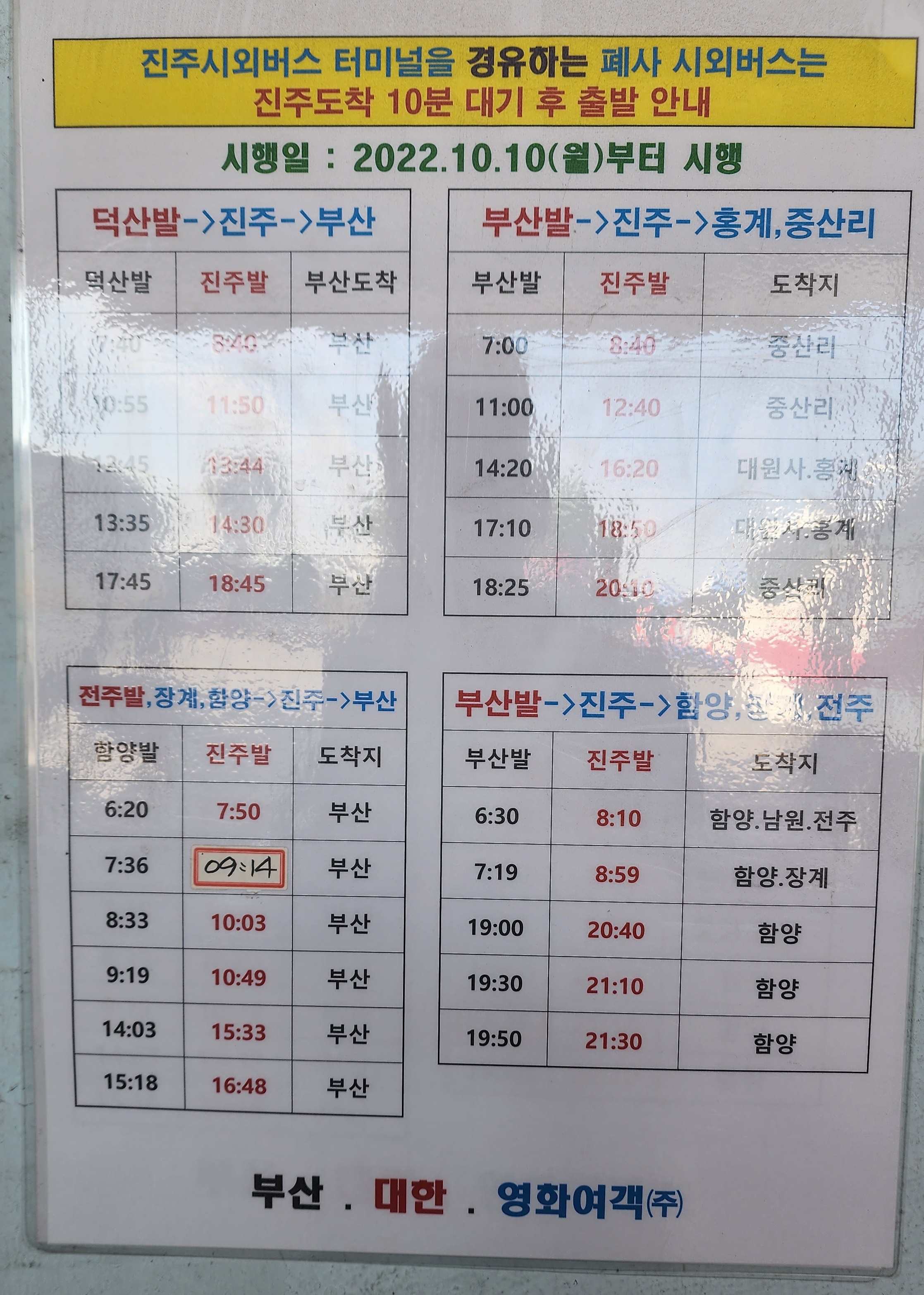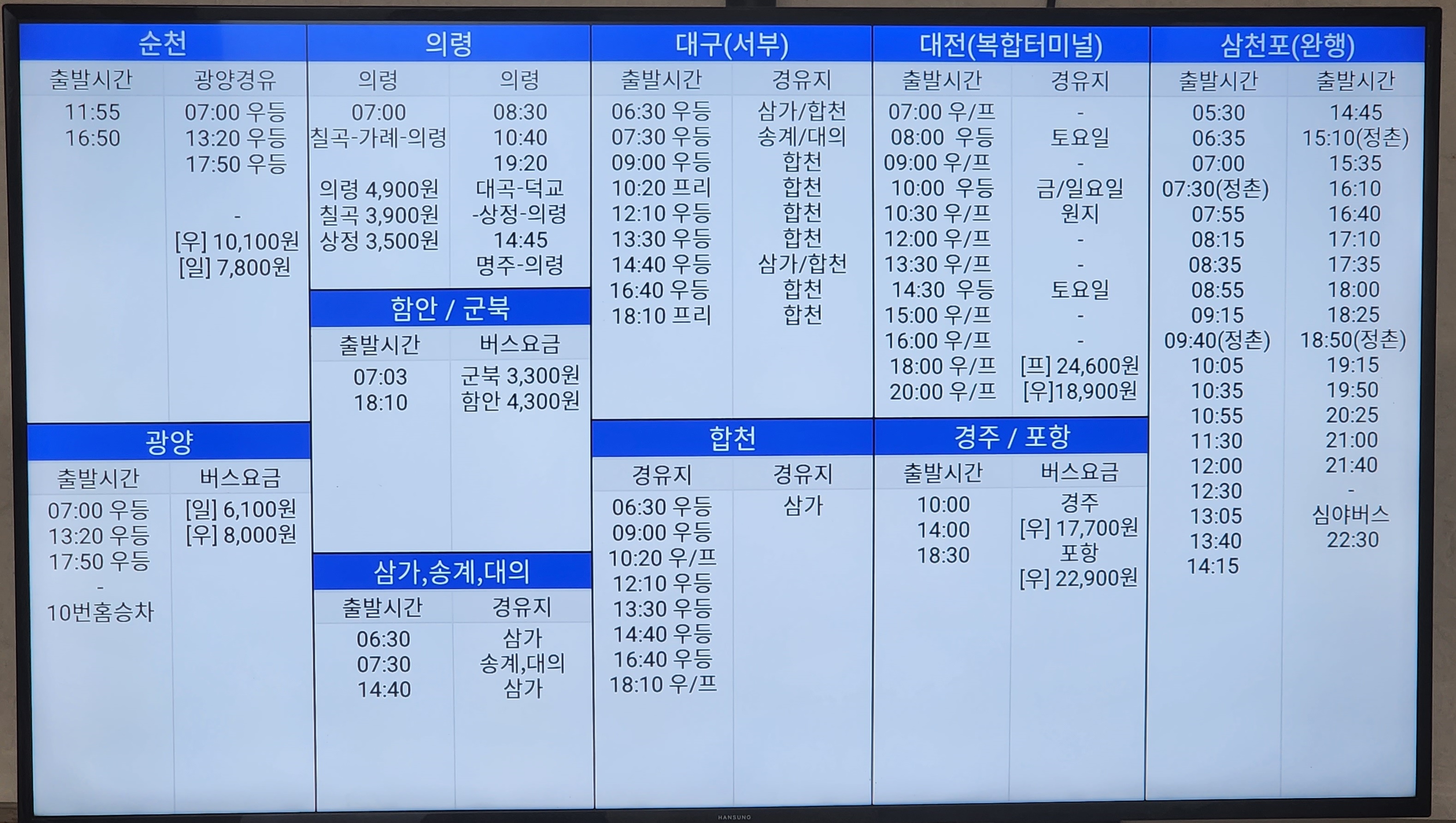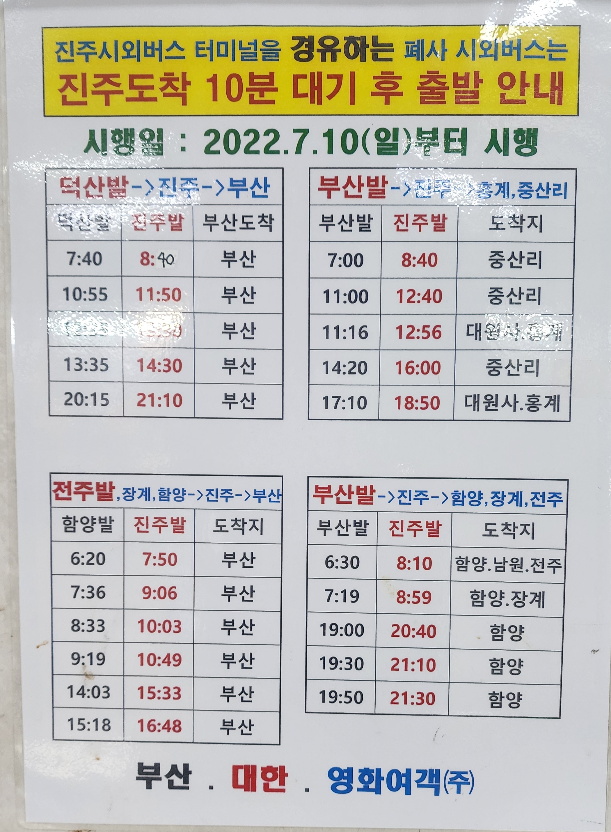 진주 출발 순천, 광양, 의령, 함안, 군북, 삼가, 송계, 대의, 대구 서부, 합천, 대전 복합터미널, 경주, 포항, 삼천포 방면.