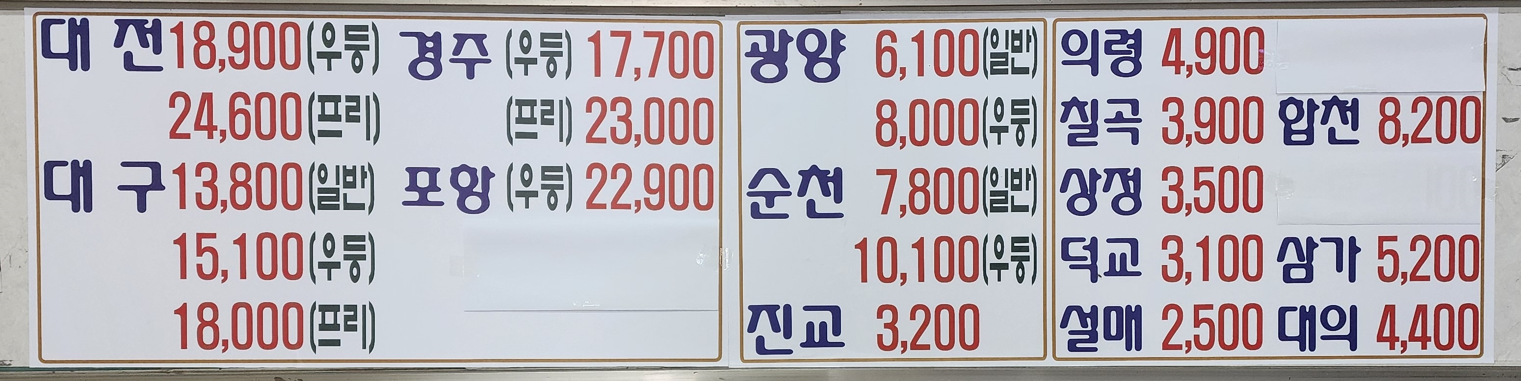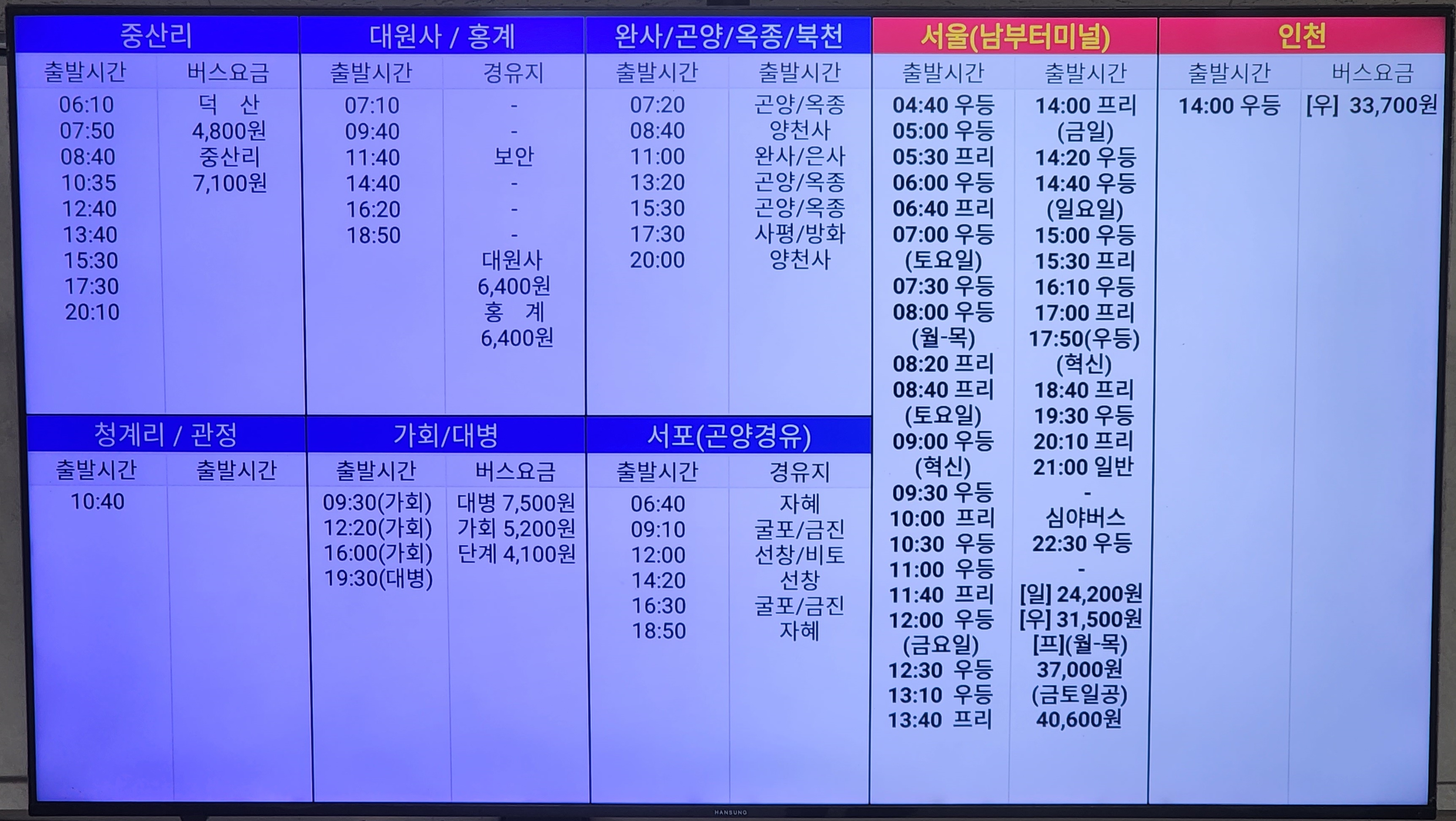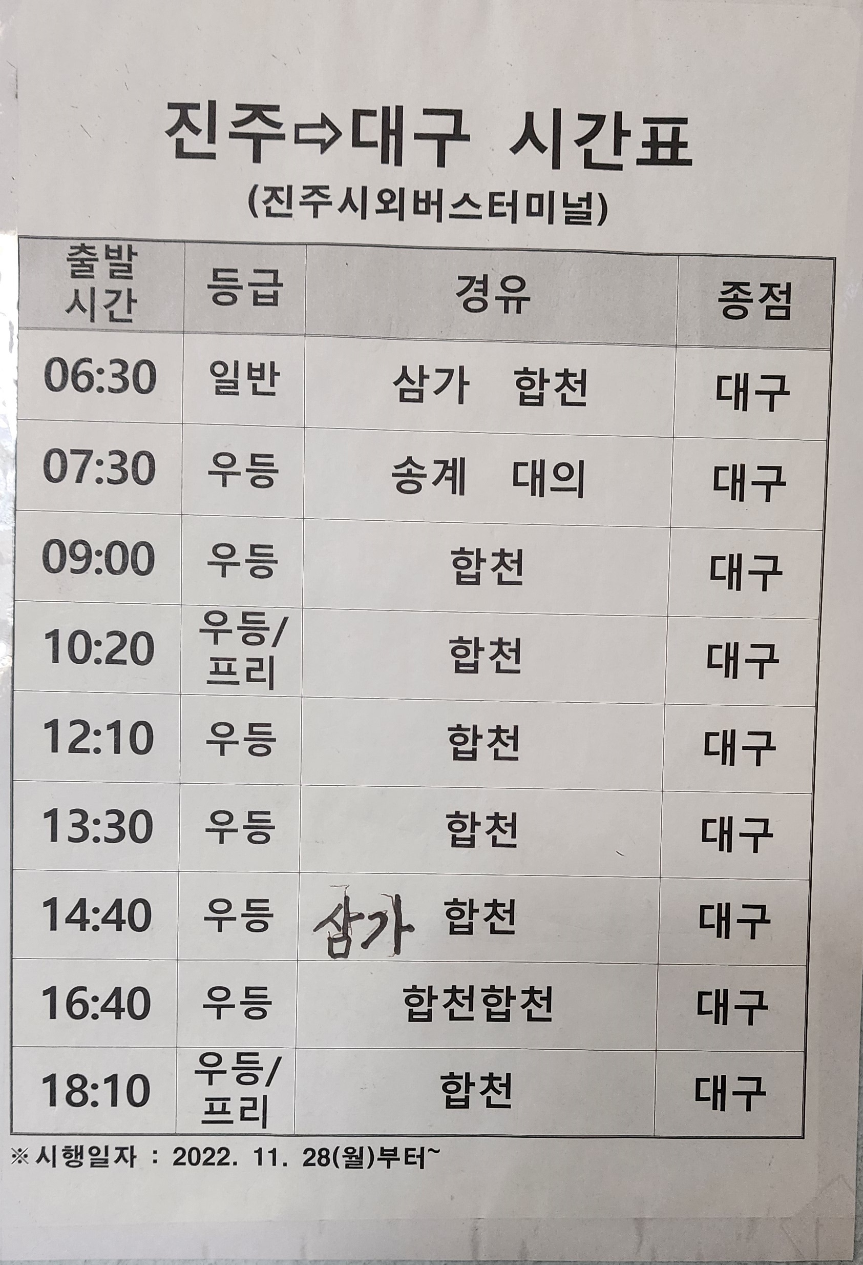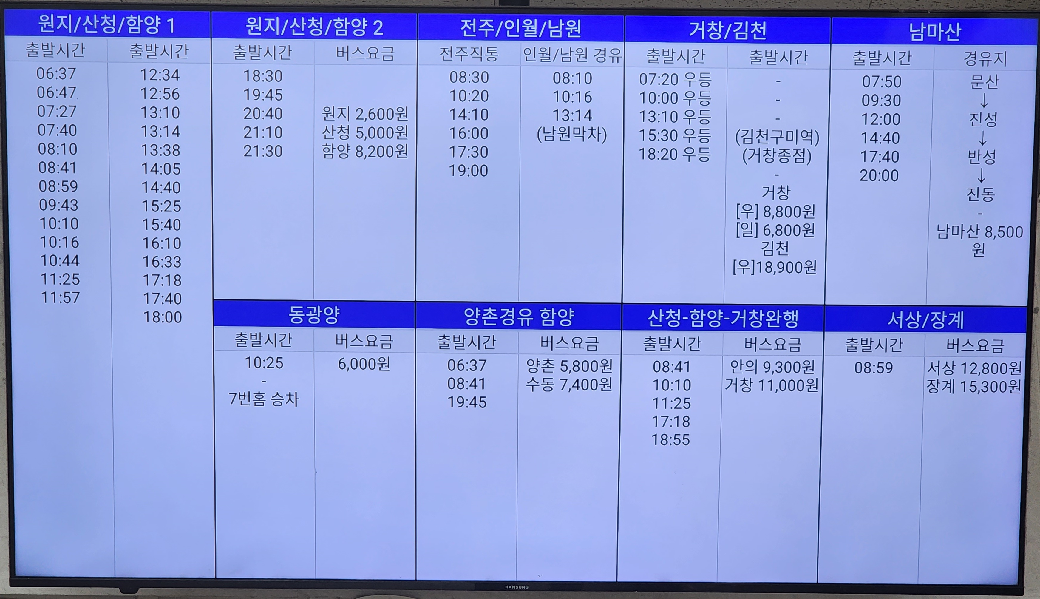 진주 출발 순천, 광양, 의령, 함안, 군북, 삼가, 송계, 대의, 대구 서부, 합천, 대전 복합터미널, 경주, 포항, 삼천포 방면.