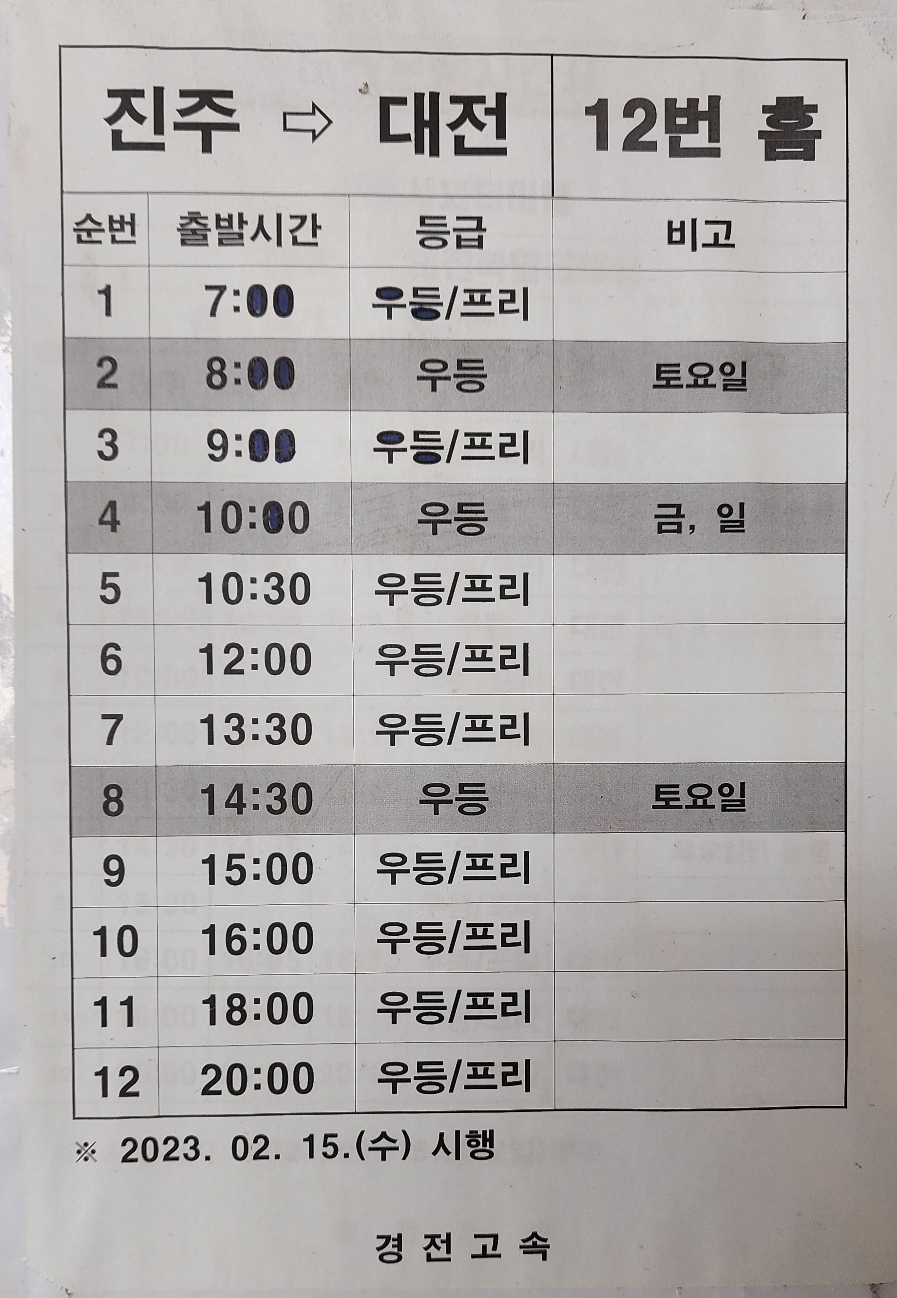 진주 출발 대전 방면.