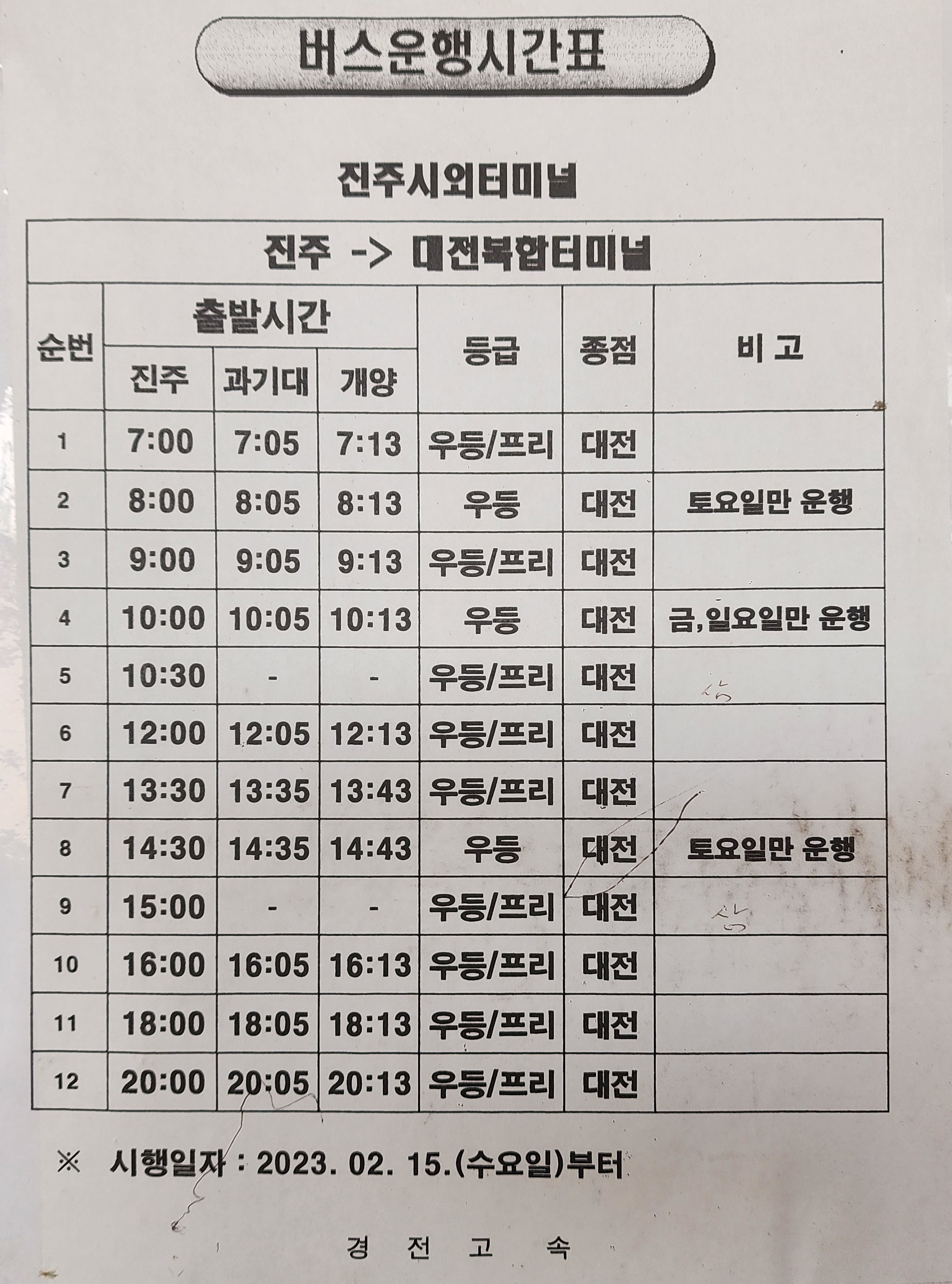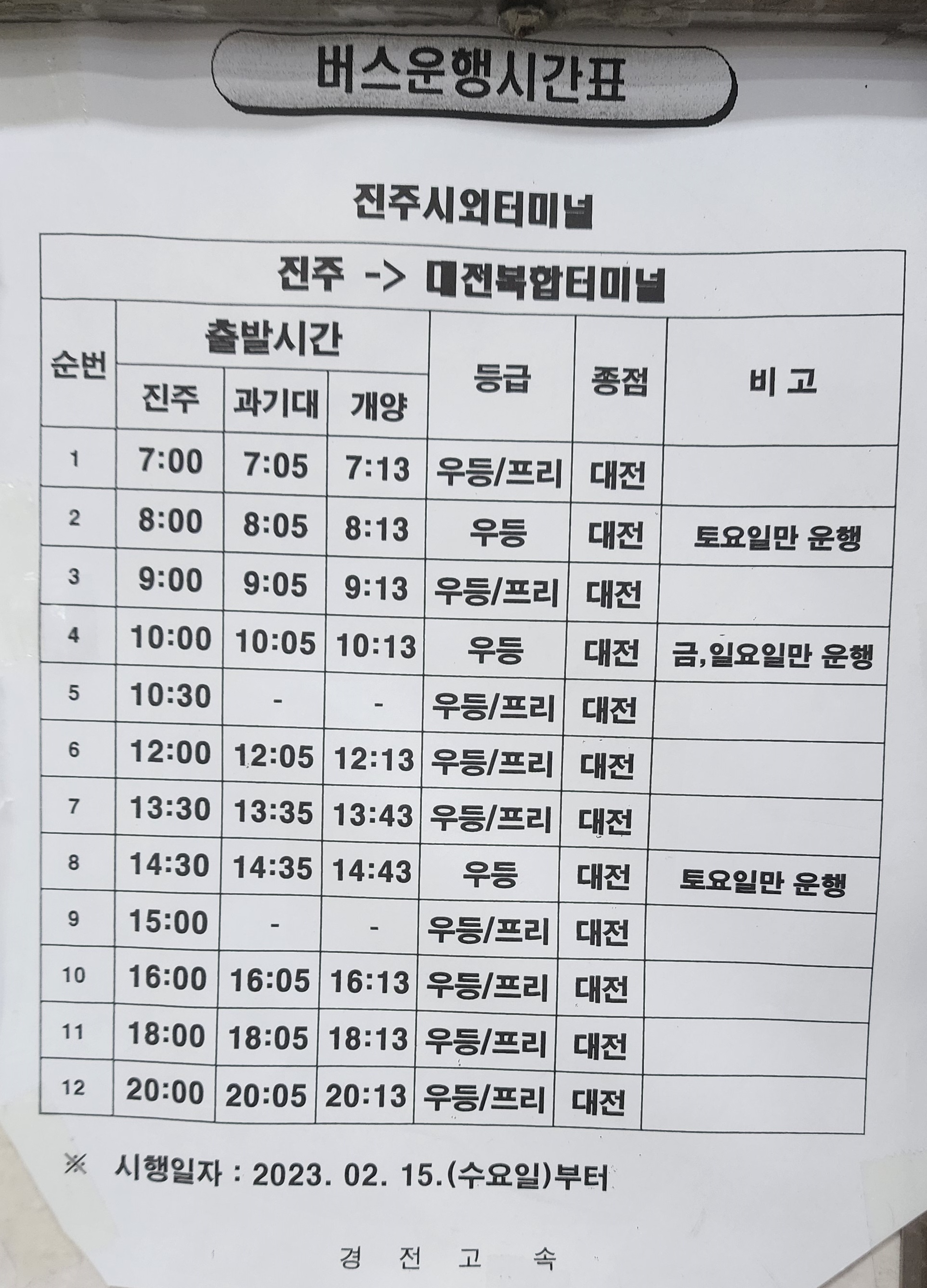 진주 출발 대전복합터미널방면.