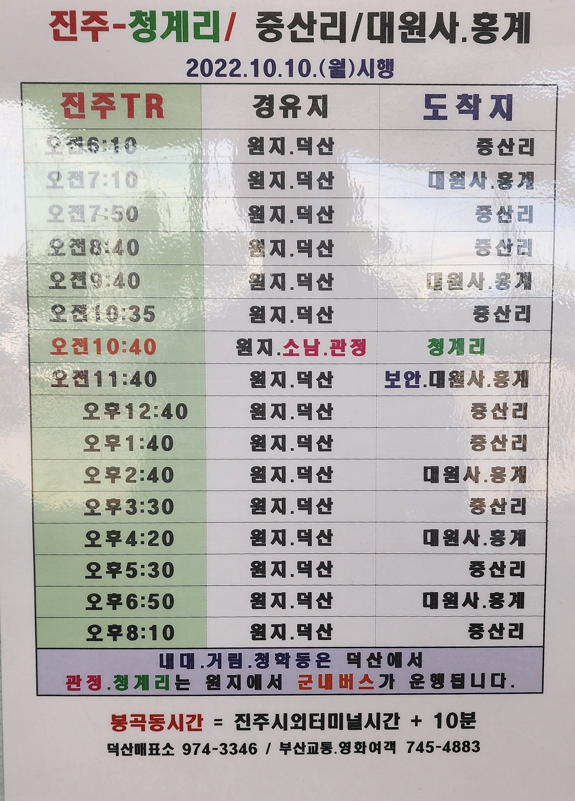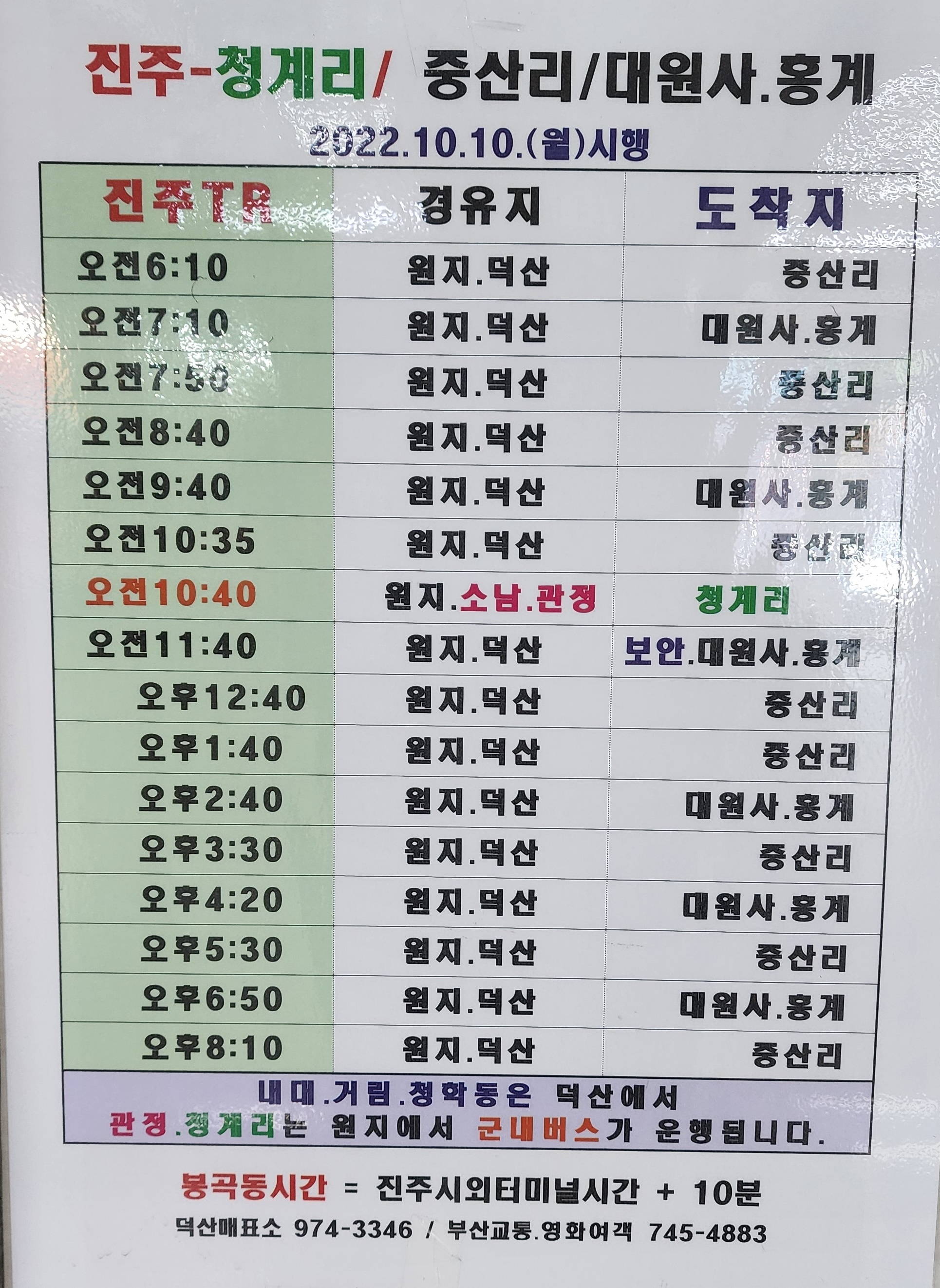 진주 출발 중산리, 청계리, 관정, 대원사, 홍계, 가회, 대병, 완사, 곤양, 옥종, 북천, 서포, 서울 남부터미널, 인천 방면.