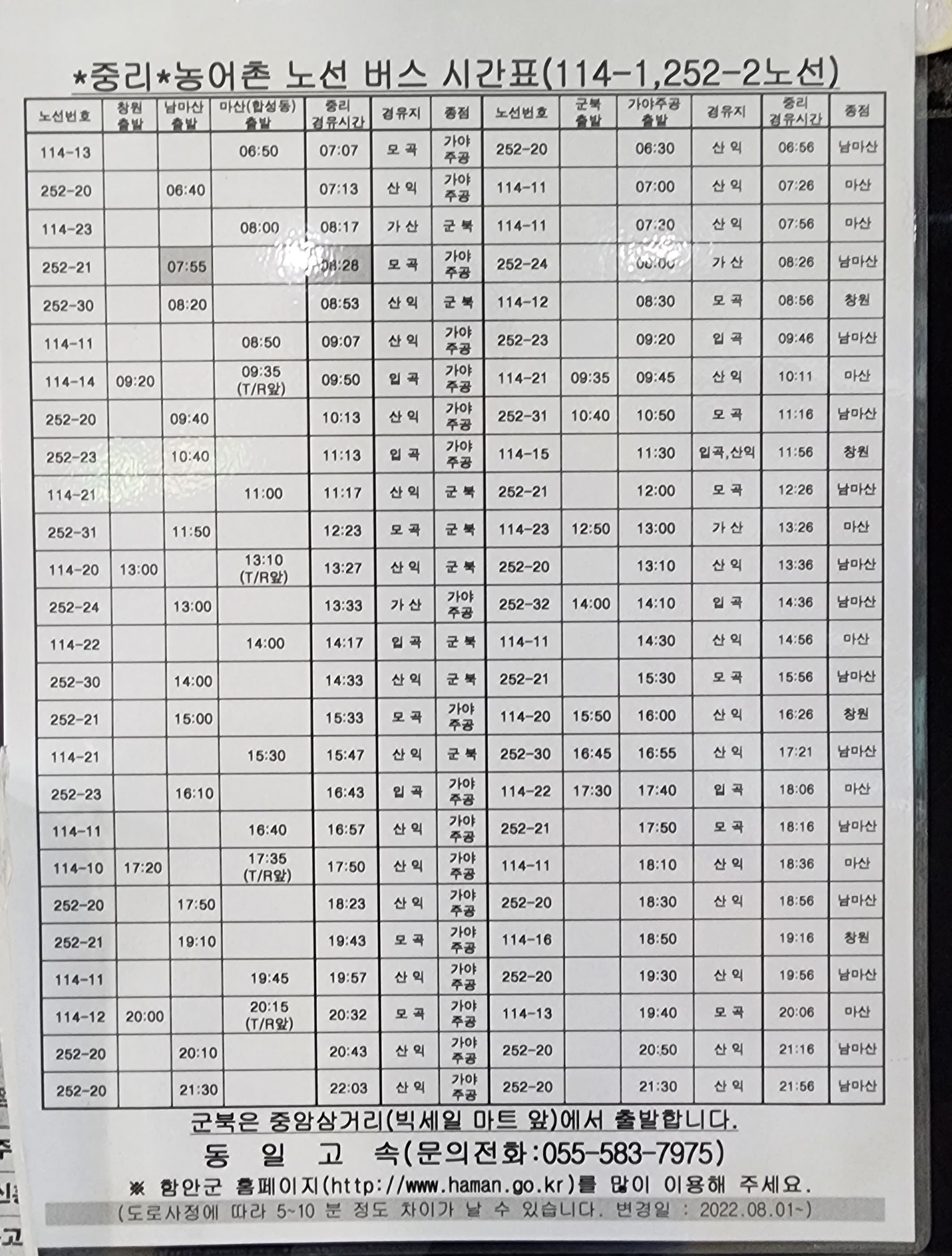 함안 출발 중리 농어촌 버스 시간표