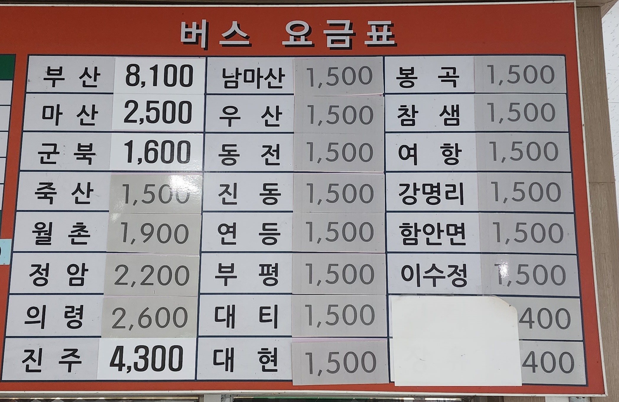 함안시외버스터미널 요금표