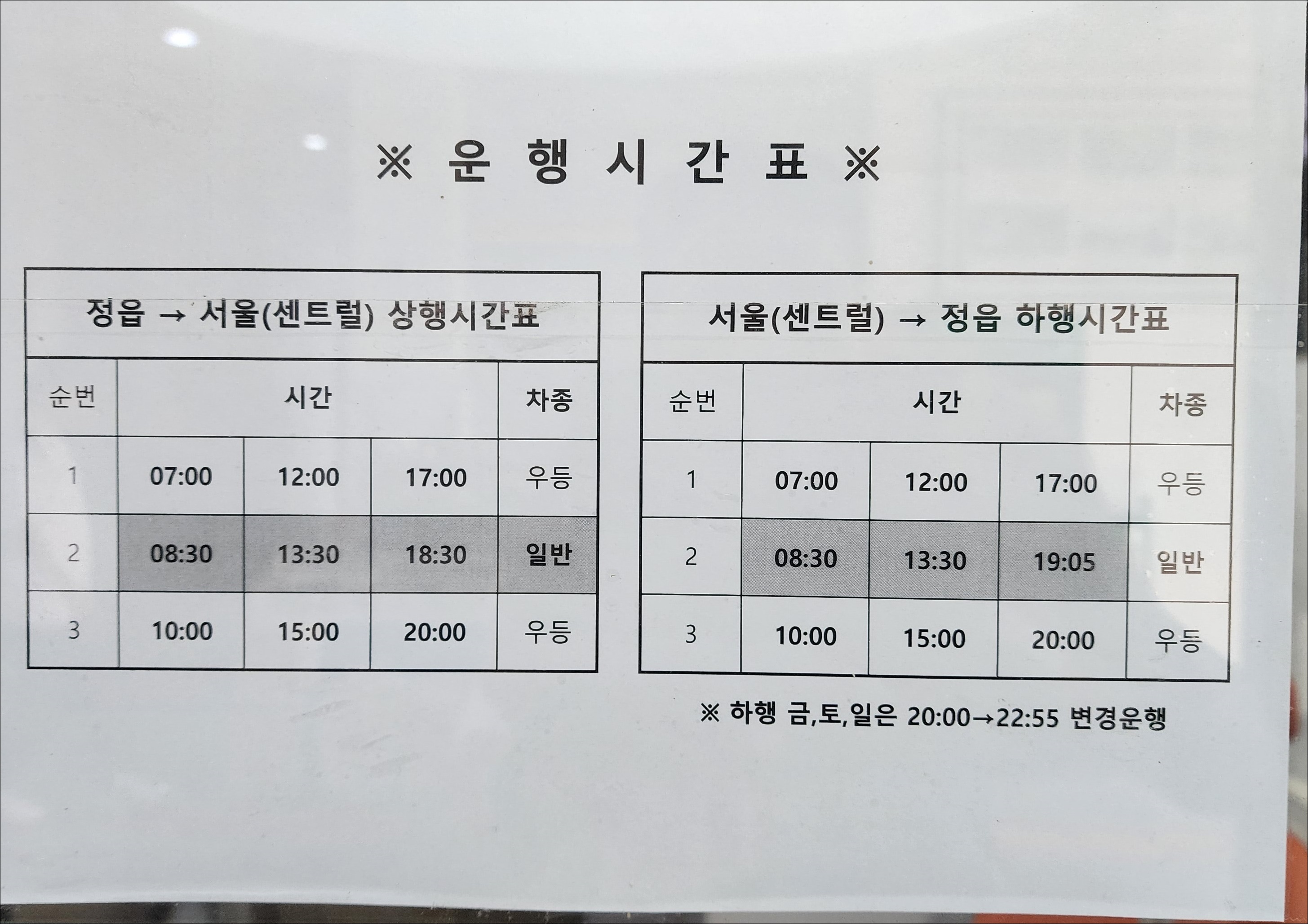 정읍 출발 서울 센트럴시티 방면.