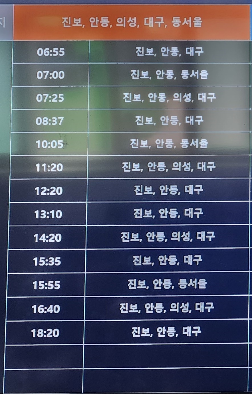 영양 출발 진보, 안동, 의성, 대구, 동서울 방면.