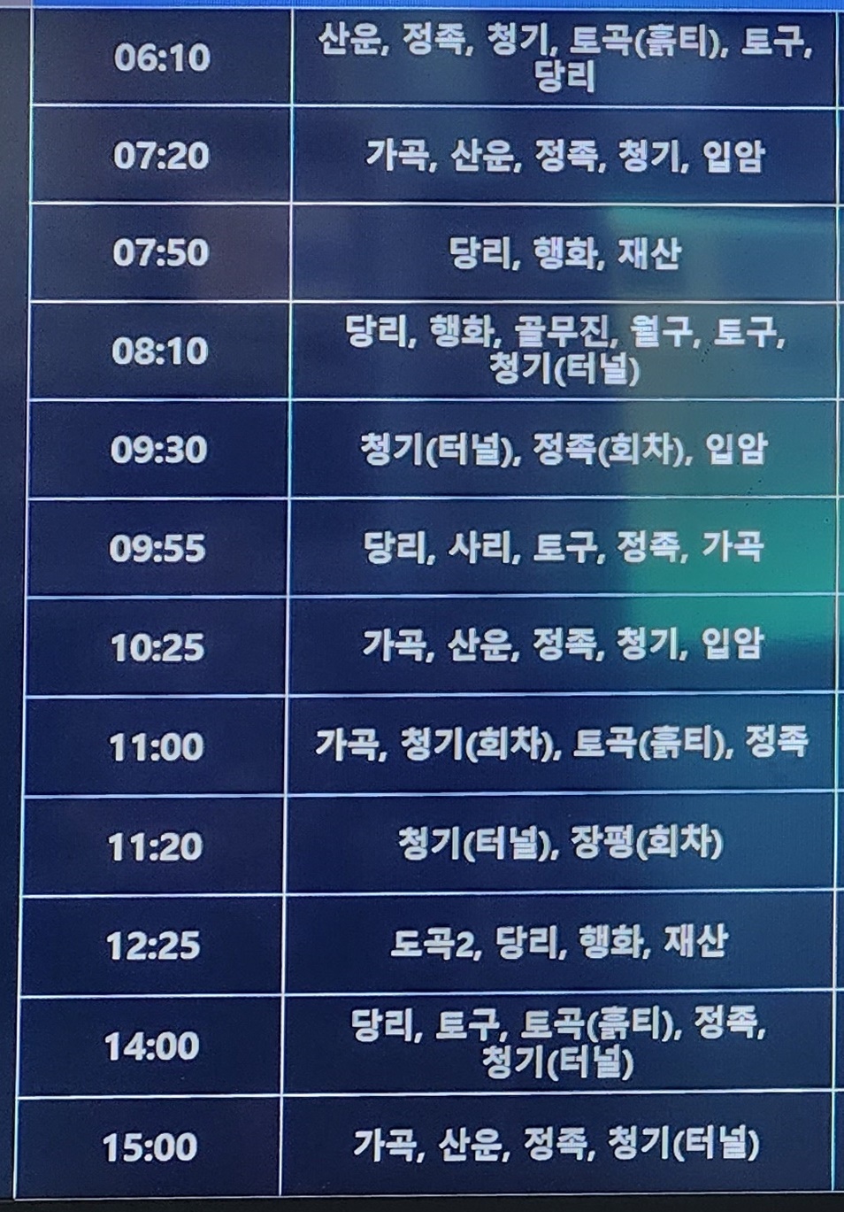 영양 출발 진보, 안동, 의성, 대구, 동서울 방면.