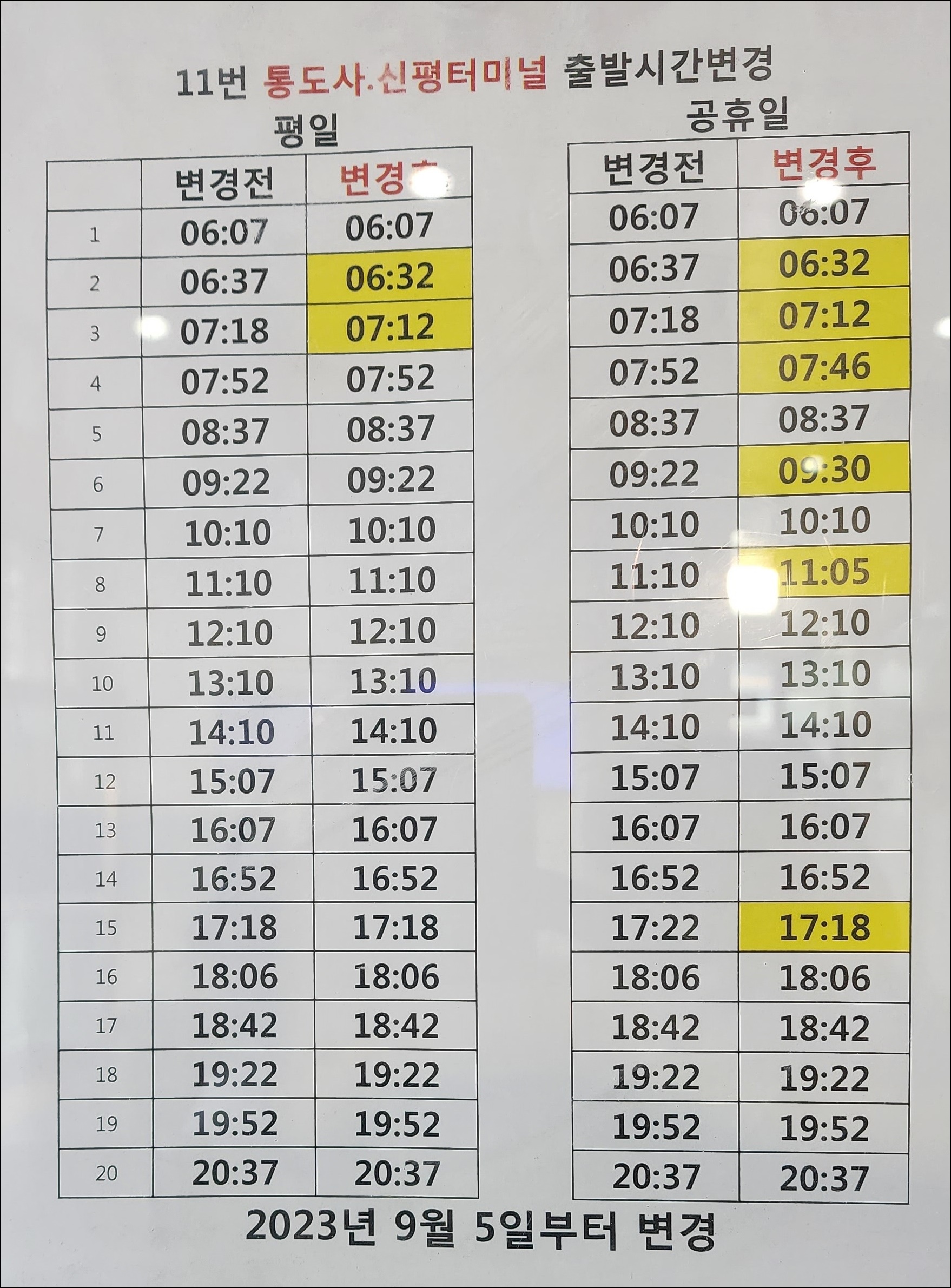 11번 통도사, 신평터미널 출발시간변경