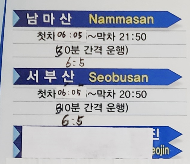 배둔 출발 남마산, 서부산 방면.