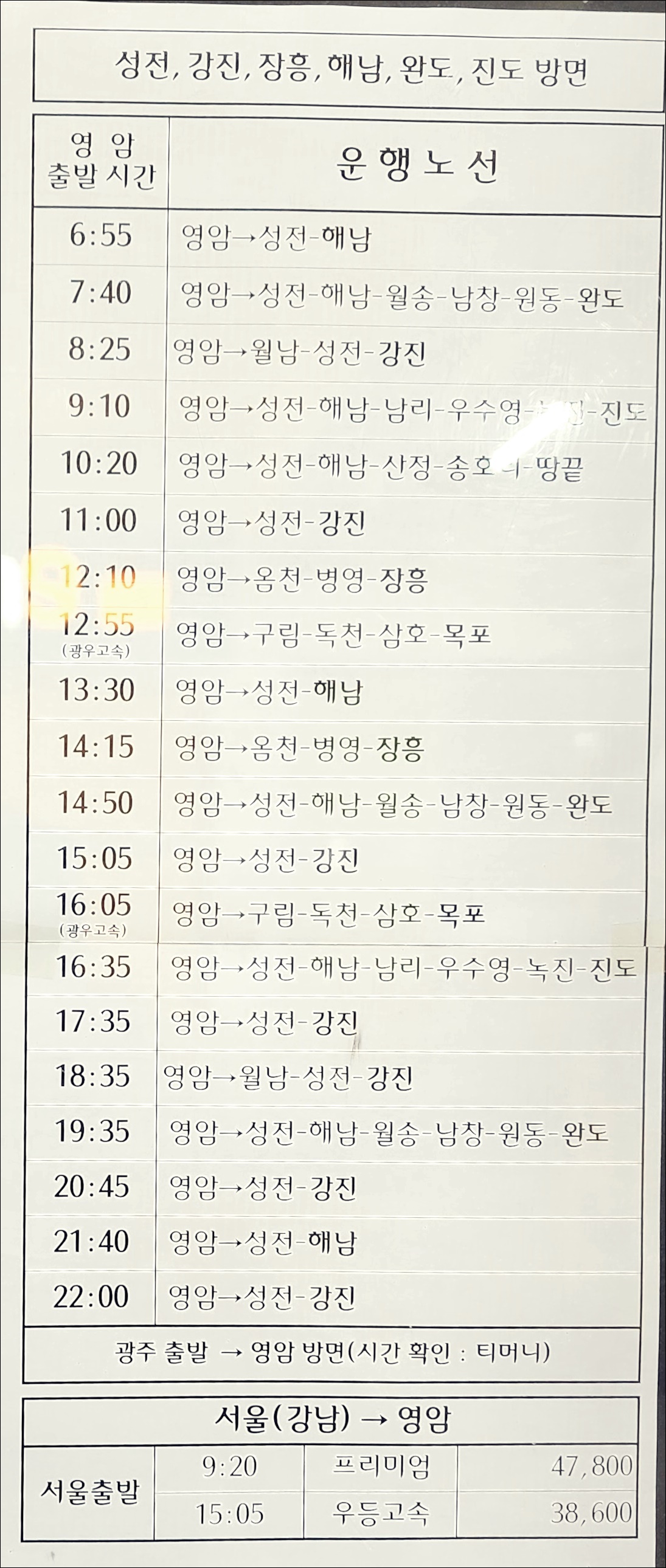 영암 출발 성전, 강진, 장흥, 해남, 완도, 진도 방면.