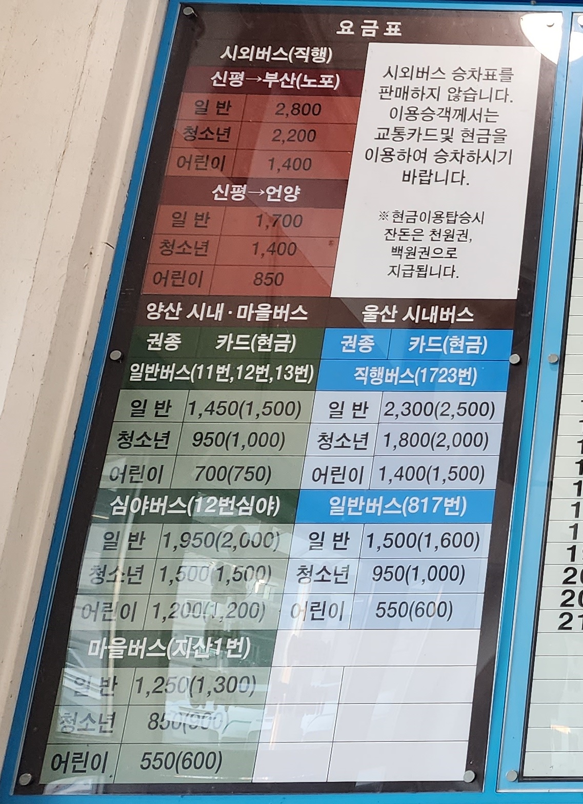신평시외버스터미널 요금표