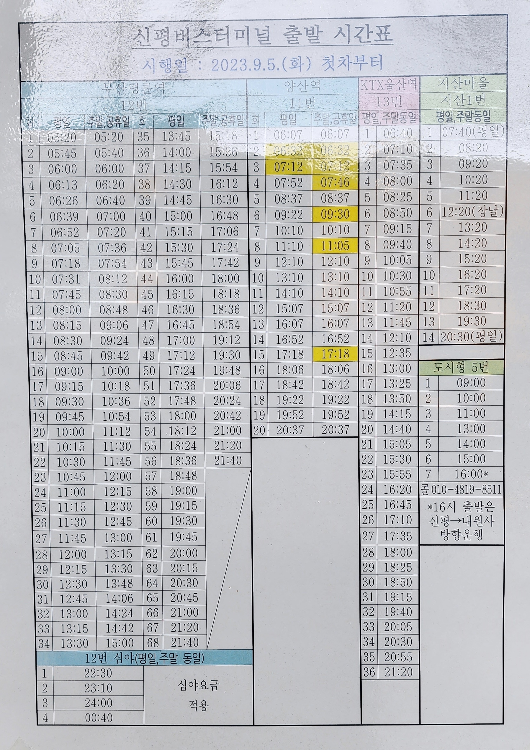 신평시외버스터미널 양산시내버스 마을버스 시간표