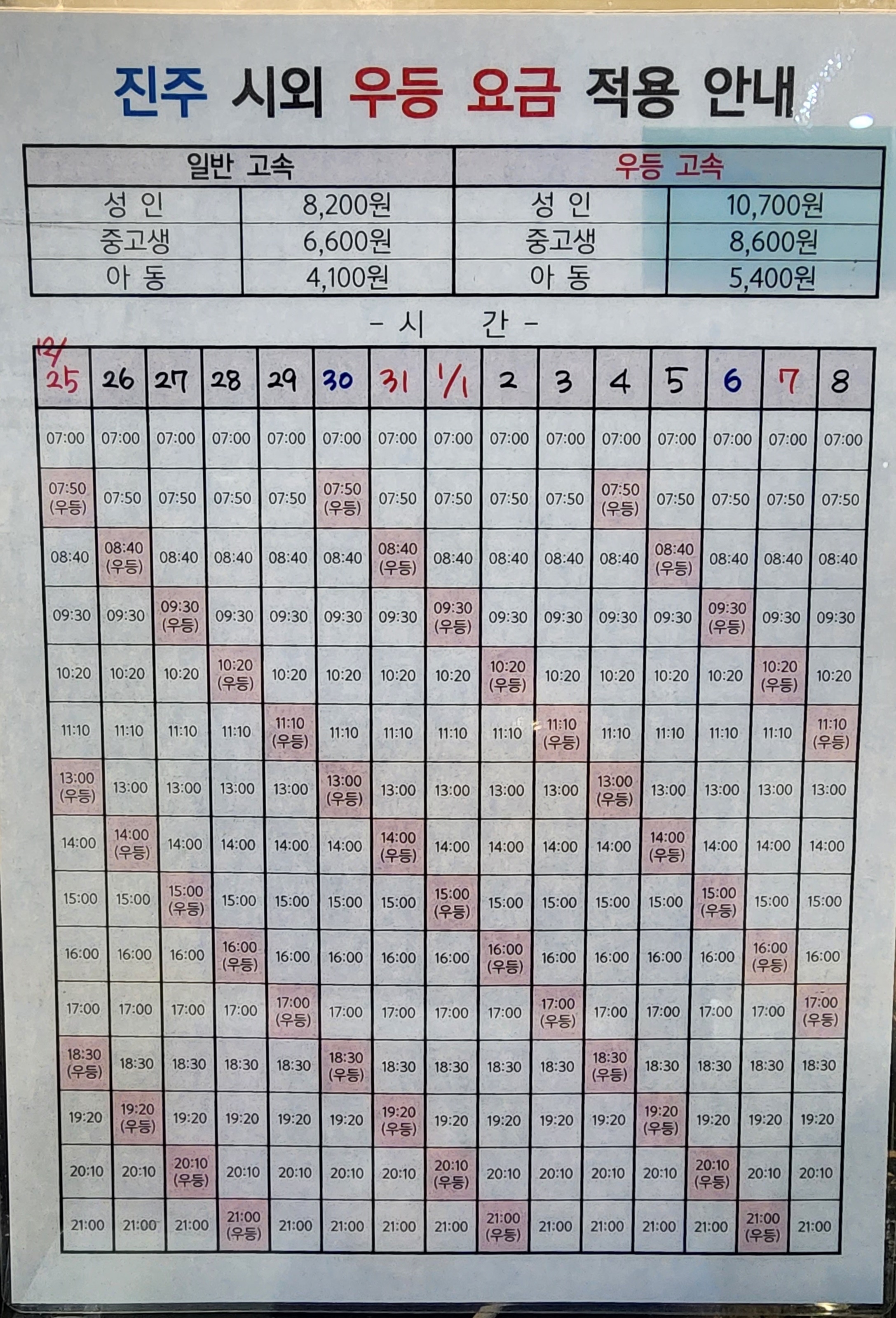 김해 출발 진주 시외 우등 요금 적용 안내.