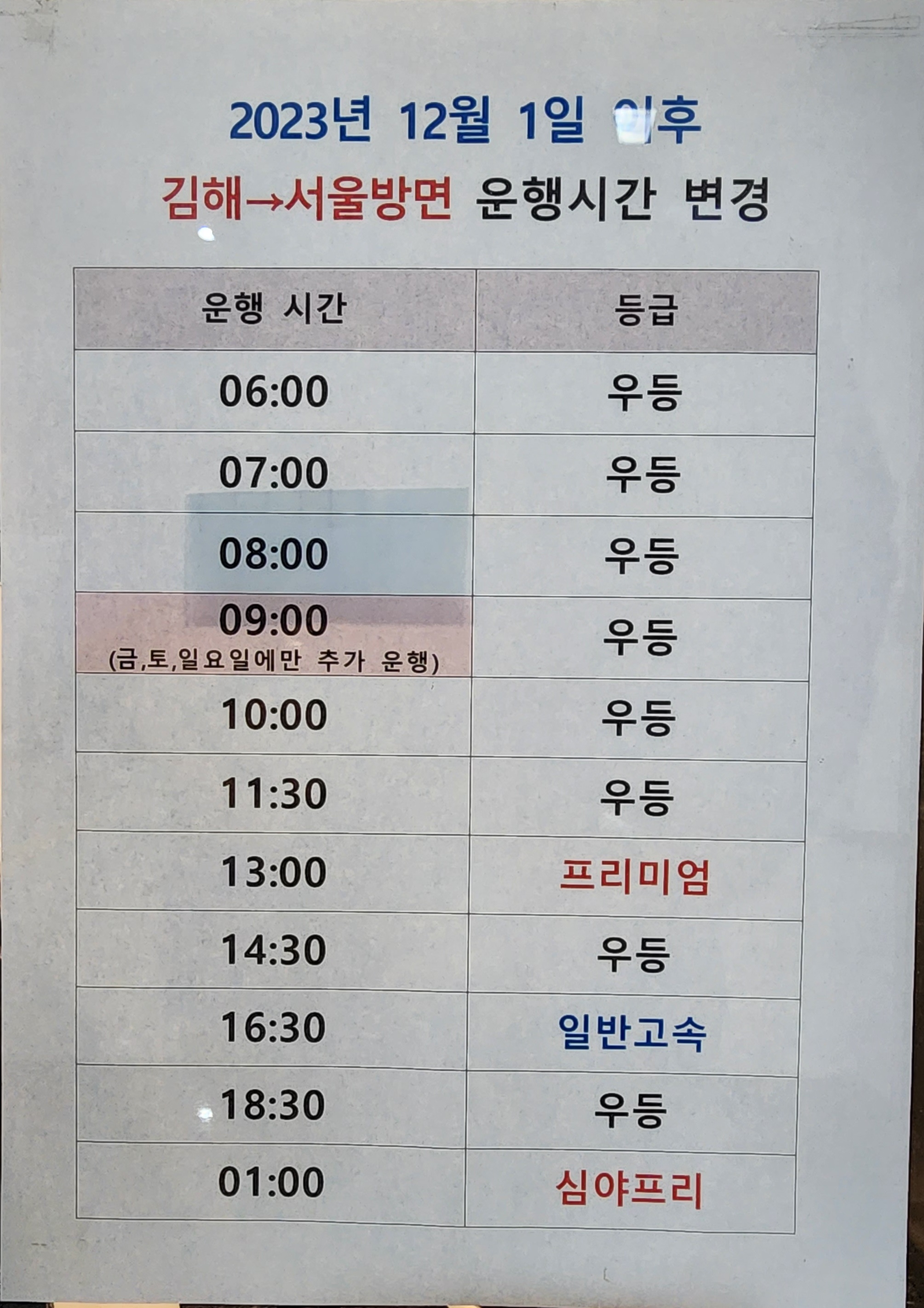 김해 출발 서울 방면 시간표