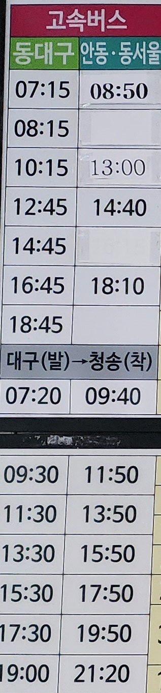 청송 출발 동대구, 안동, 동서울 방면.