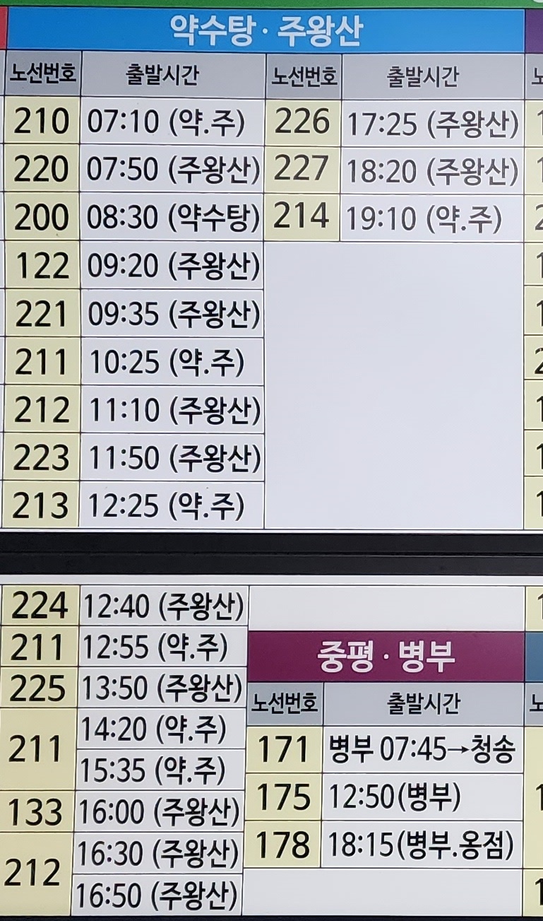 청송 출발 약수탕, 주왕산, 중평, 병부 방면.