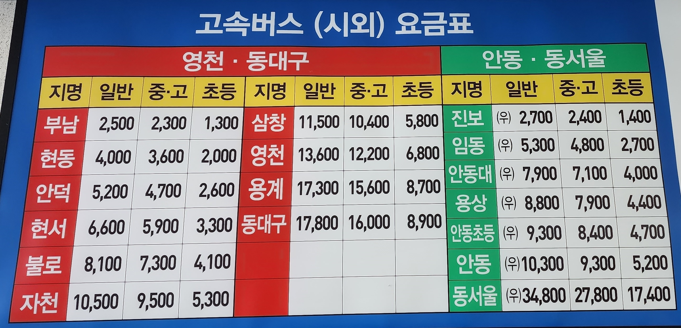 청송 출발 동대구, 안동, 동서울 방면.