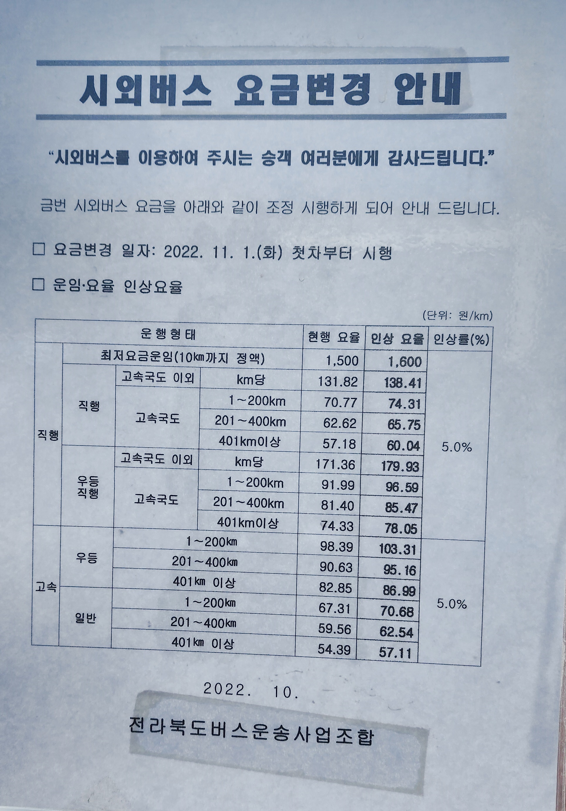 내소사 시외버스 요금 변경 안내