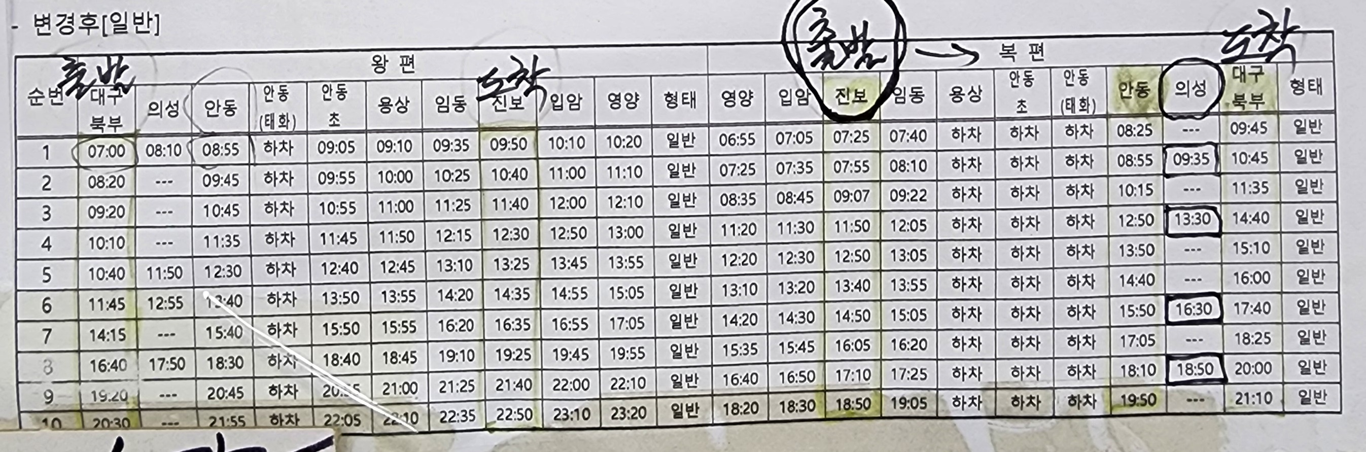 경기여객 안동터미널 출발 진보터미널 도착 시간