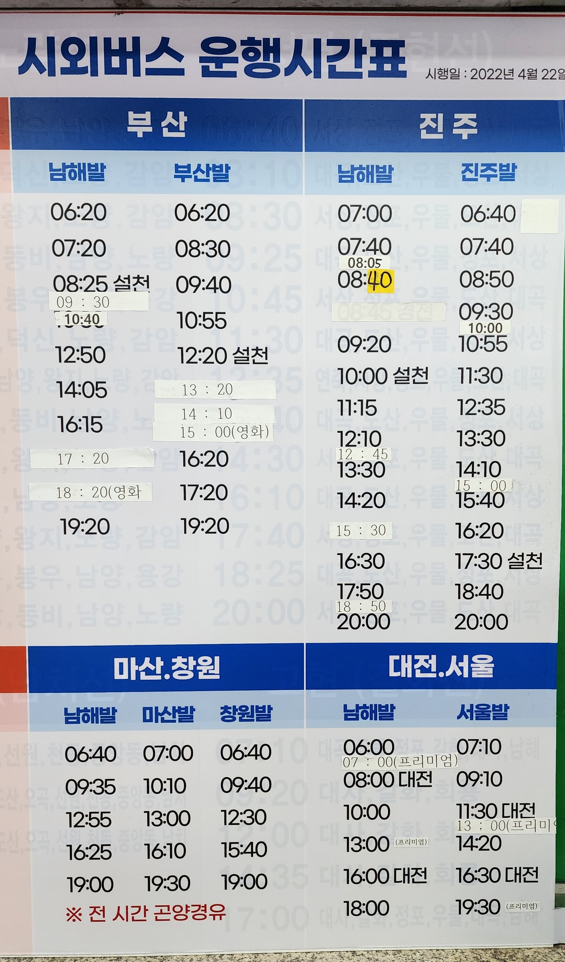 남해 출발 부산, 진주, 마산, 창원, 대전, 서울 방면.