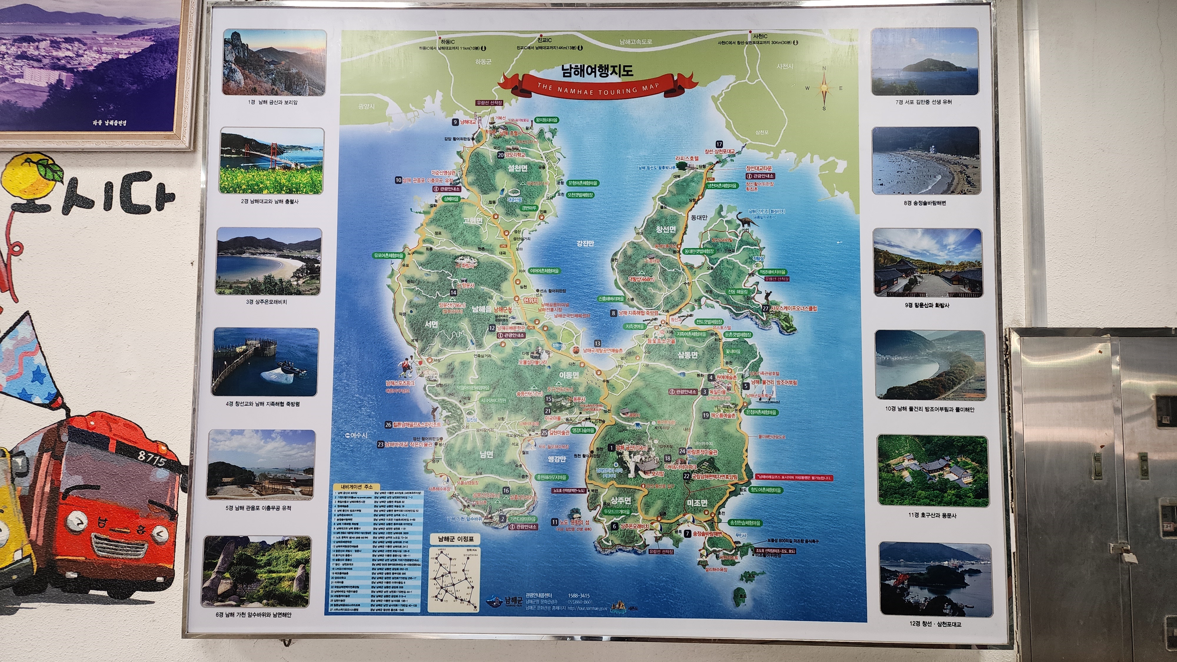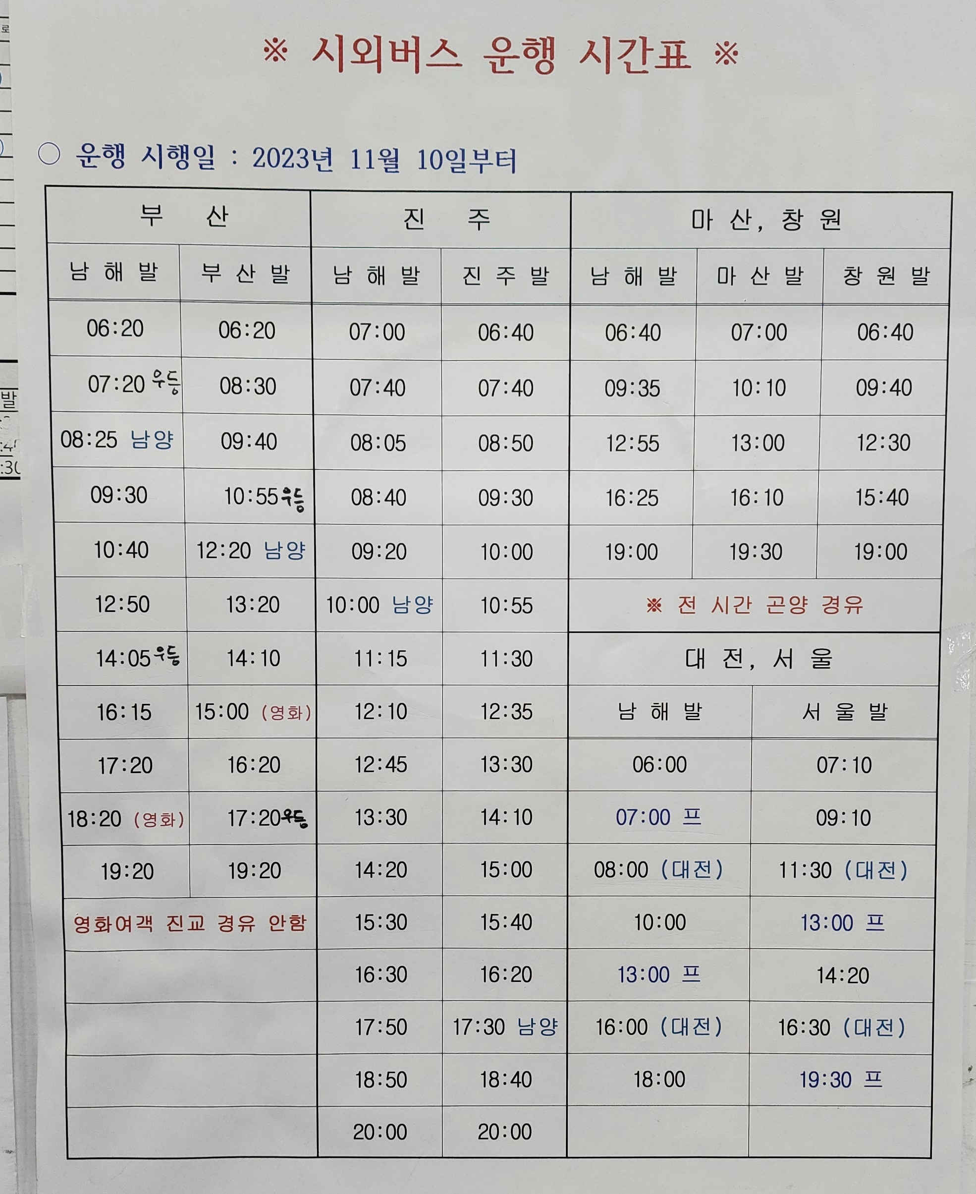 남해 출발 부산, 진주, 마산, 창원, 대전, 서울 방면.