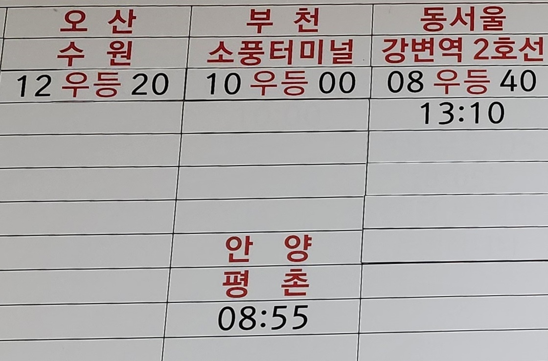 익산 출발 오산, 수원, 부천, 소풍터미널, 안양, 평천, 동서울 강변역 2호선 방면.