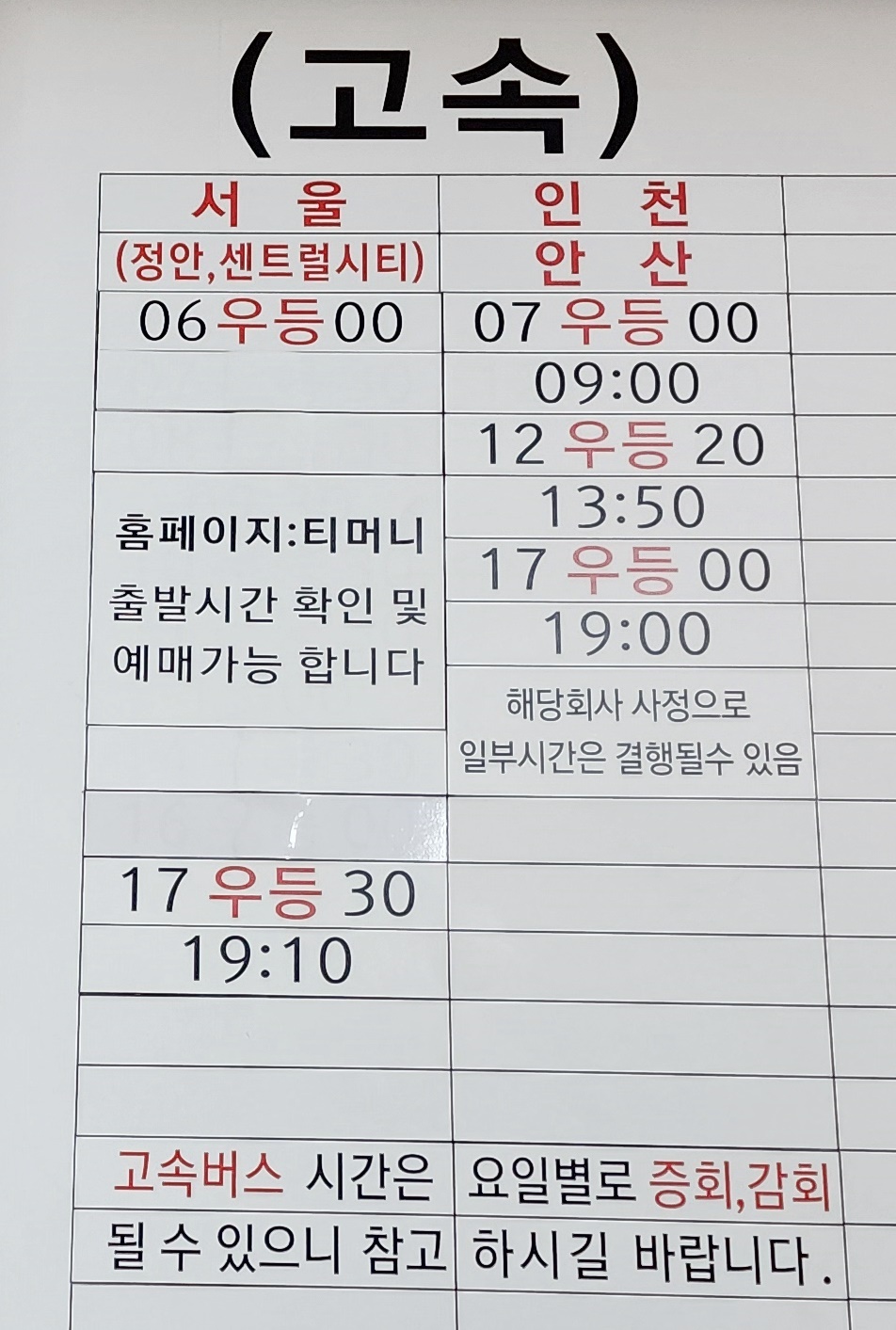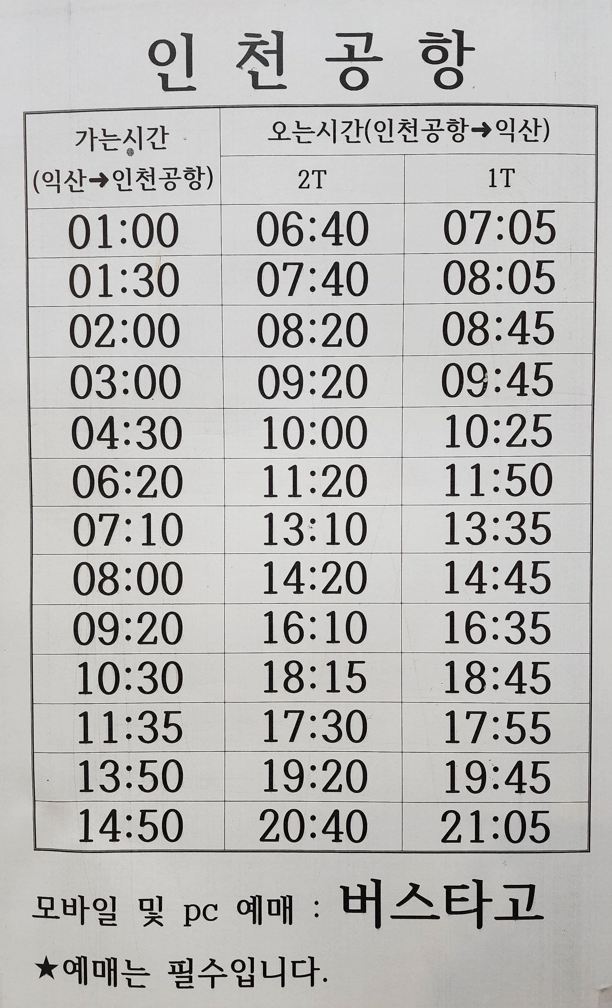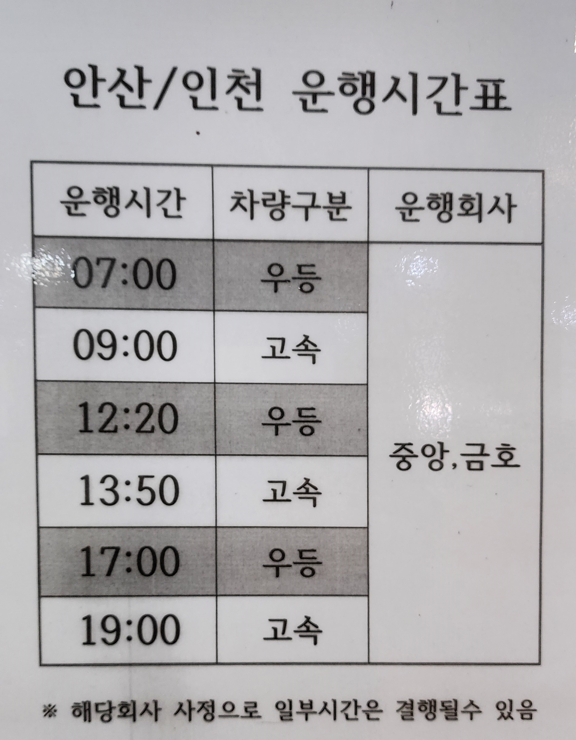 익산 출발 안산, 인천 운행 시간표