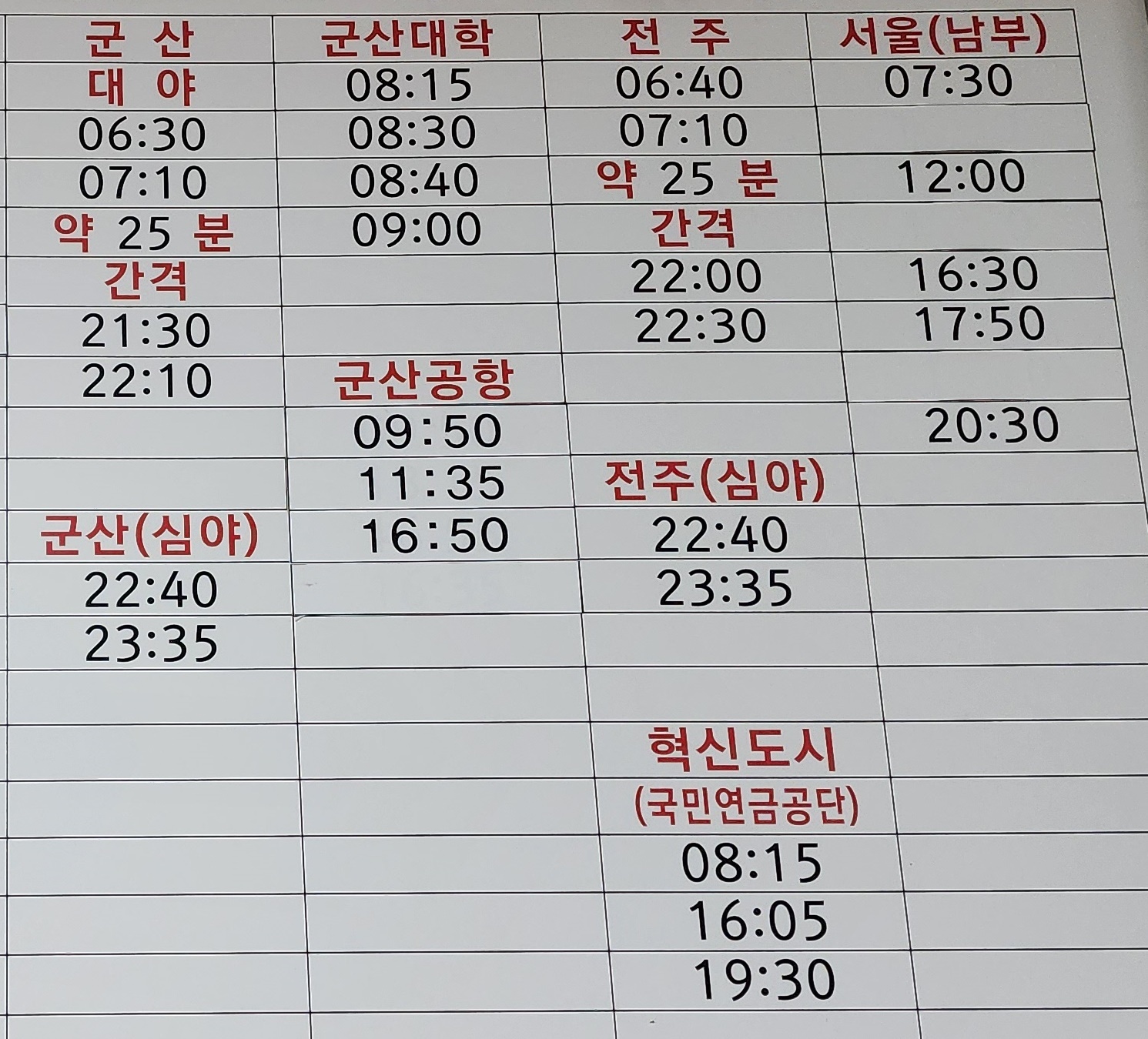익산 출발 군산, 대야, 군산대학, 군산공항, 전주, 혁신도시, 서울 남부 방면.