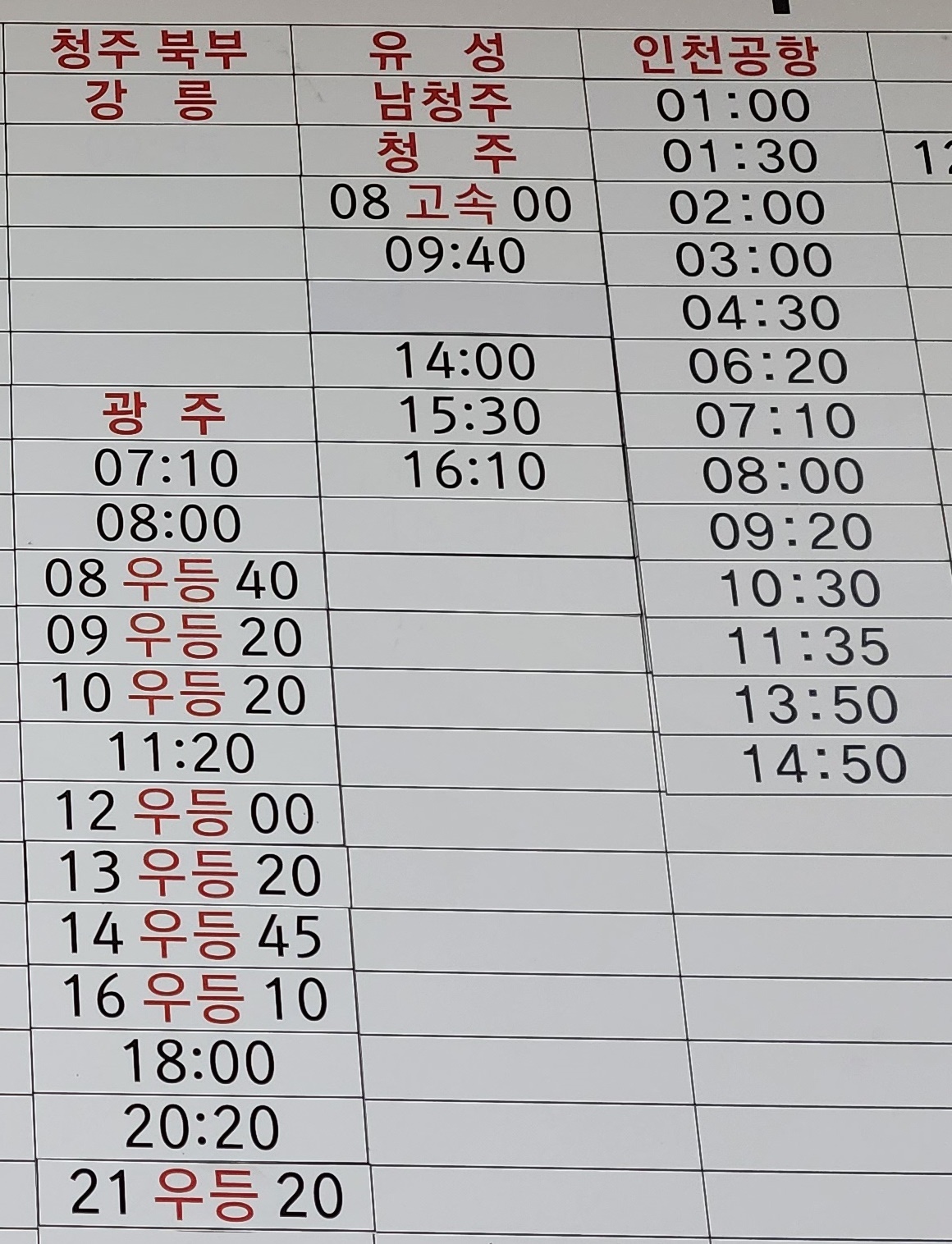 익산 출발 광주, 유성, 남청주, 청주, 인천공항 방면.