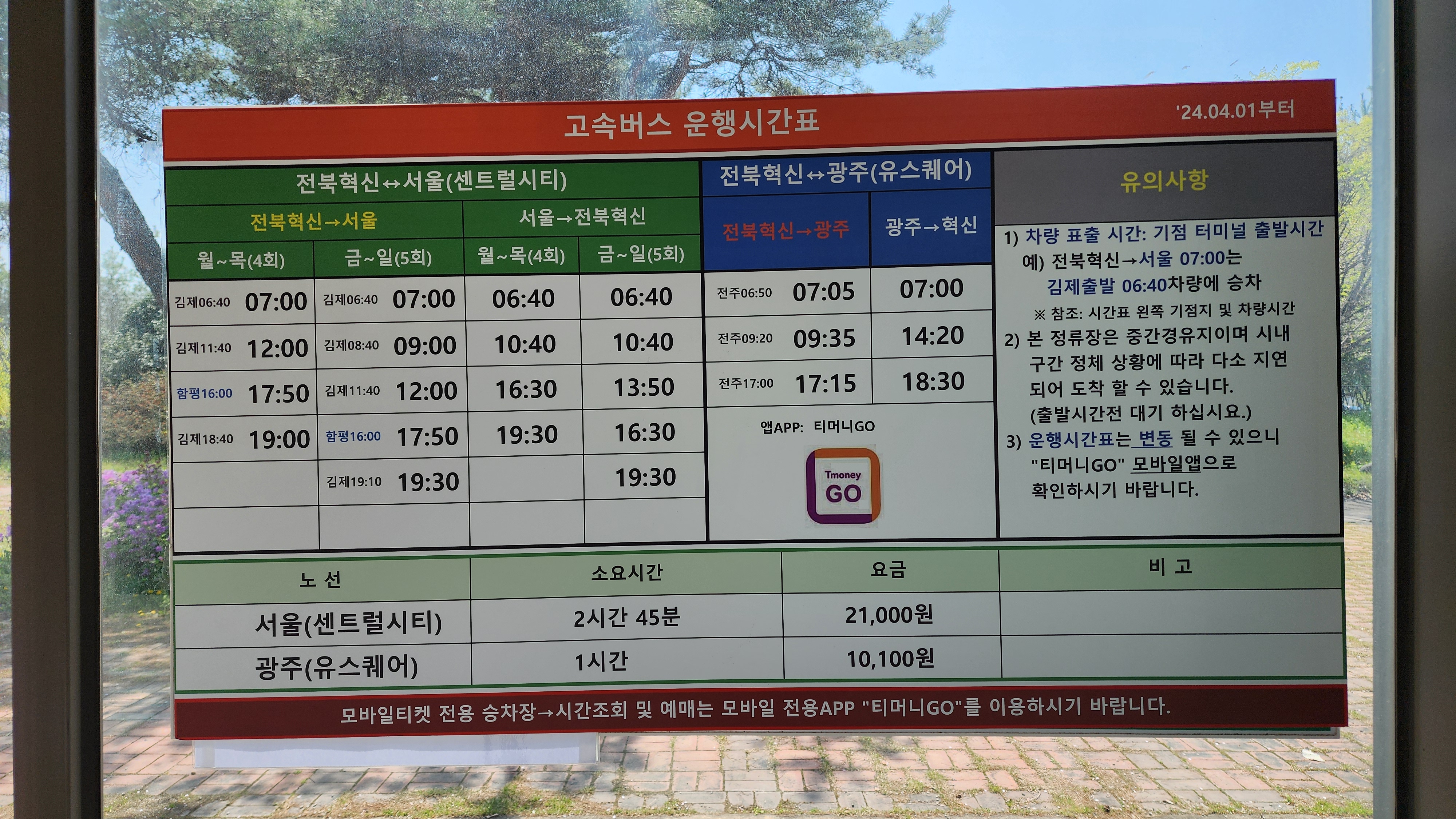 전북혁신 출발 서울 센터를시티, 광주 유스퀘어 방면,