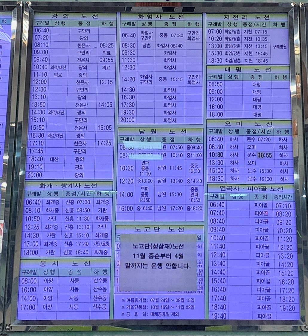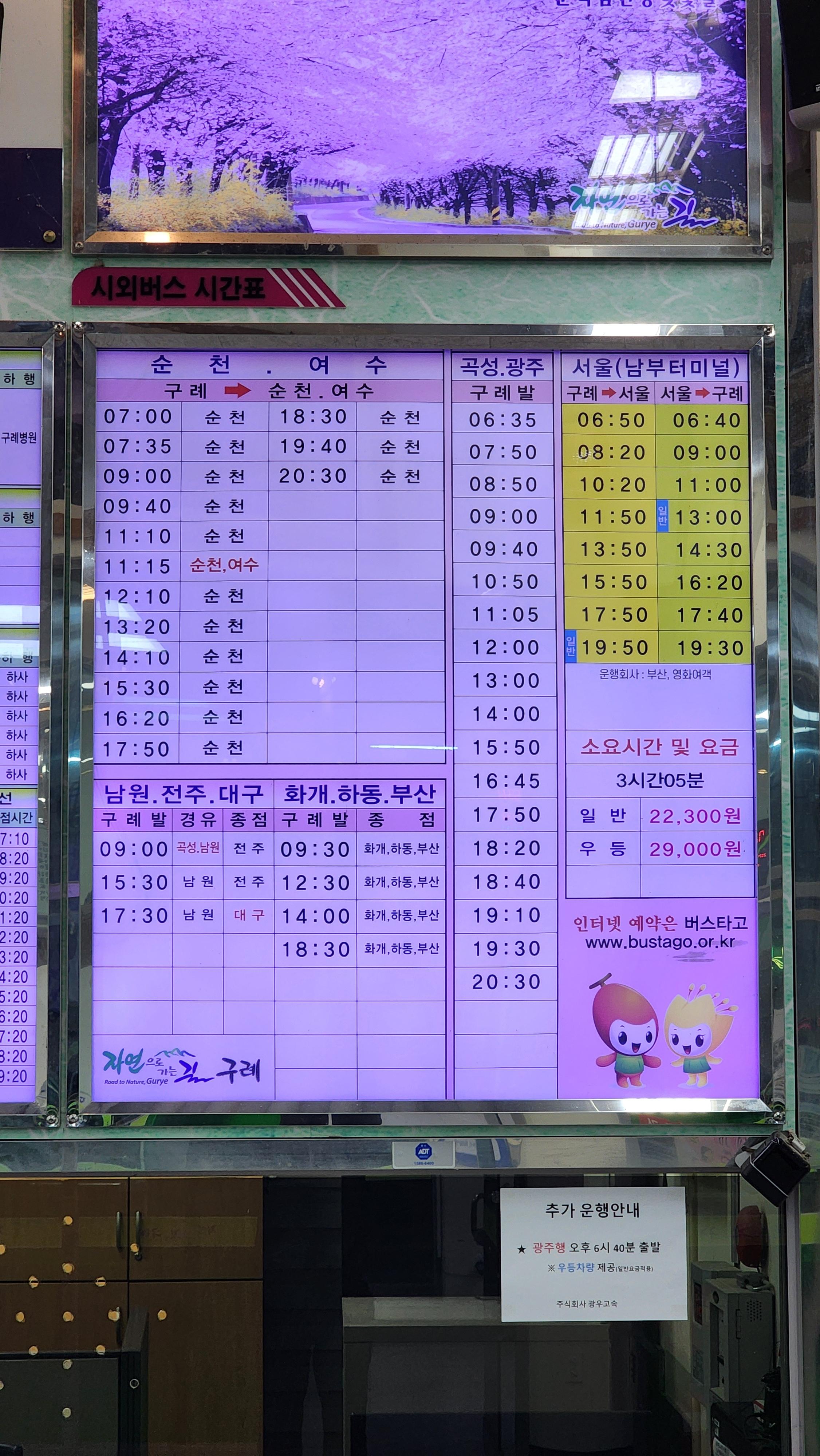 구례 출발 순천, 여수, 남원, 전주, 대구, 화개, 하동, 부산, 곡성, 광주, 서울 남부터미널 방면.