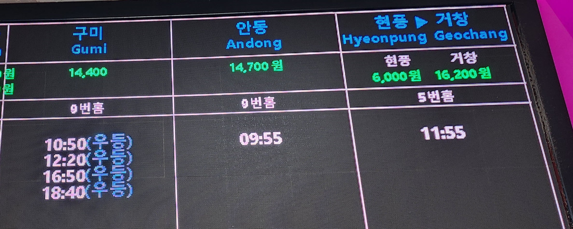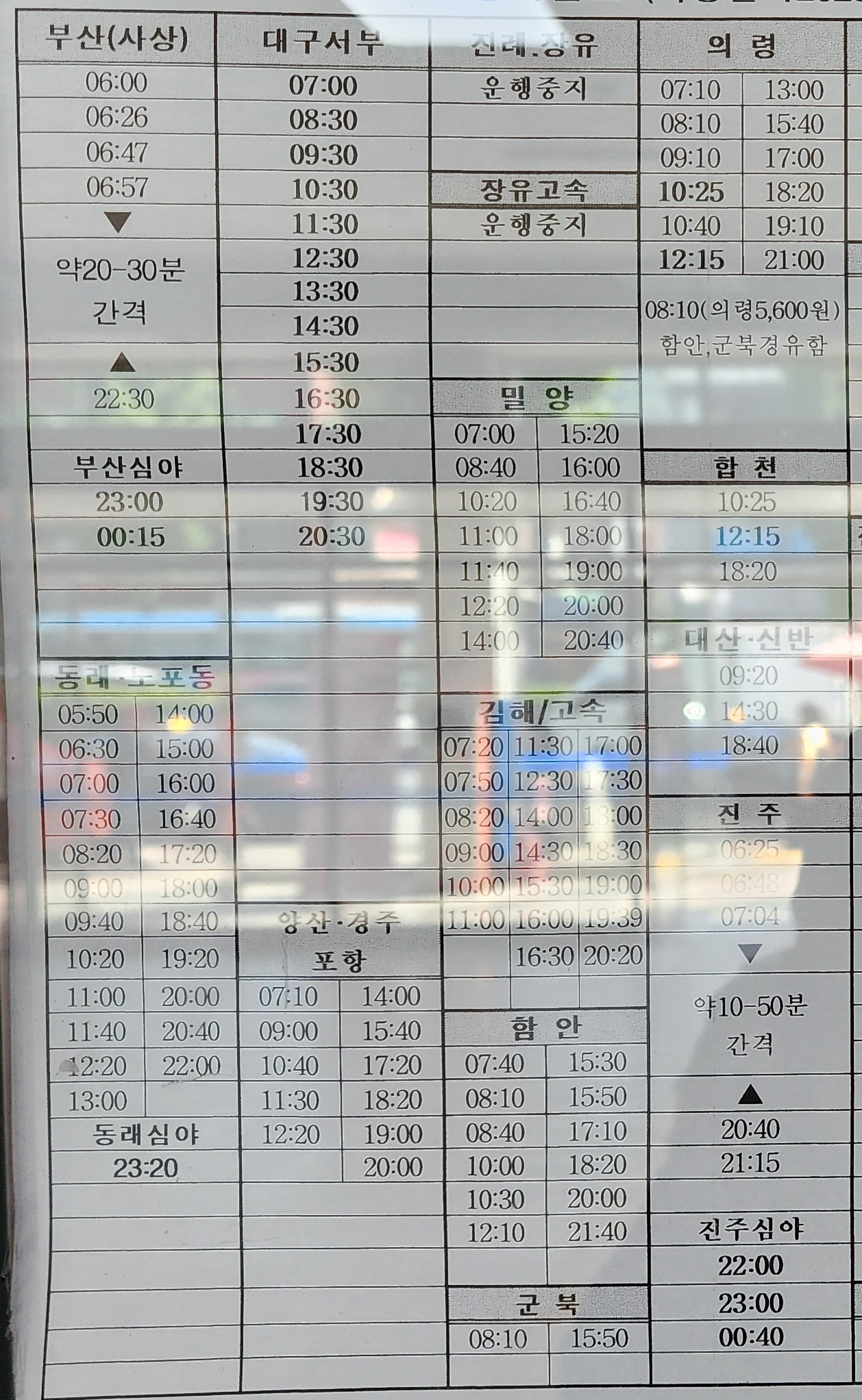 마산 출발 구미, 안동, 현풍, 거창 방면.
