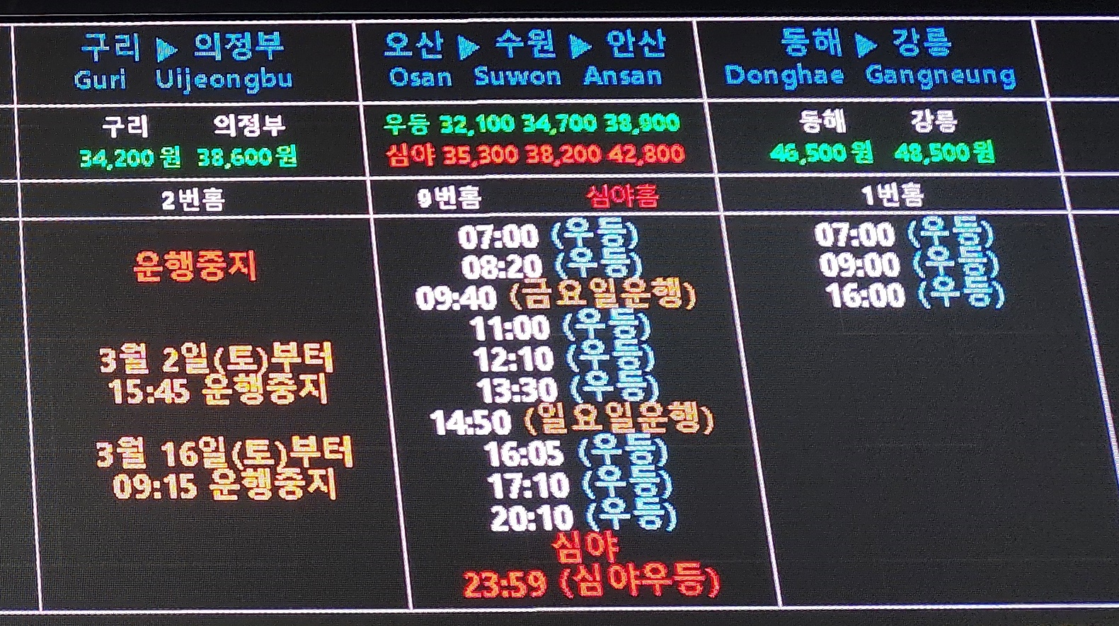 마산 출발 구리, 의정부, 오산, 수원, 안산, 동해, 강릉 방면.