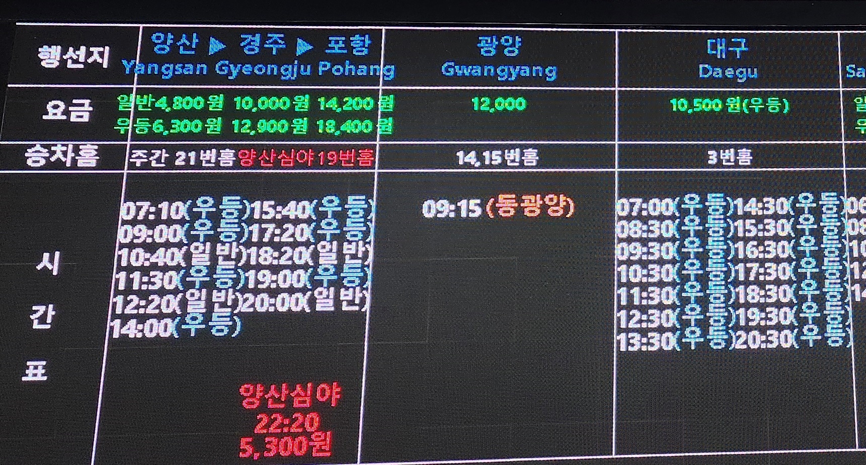 마산 출발 양산, 경주, 포항, 광양, 대구 방면.