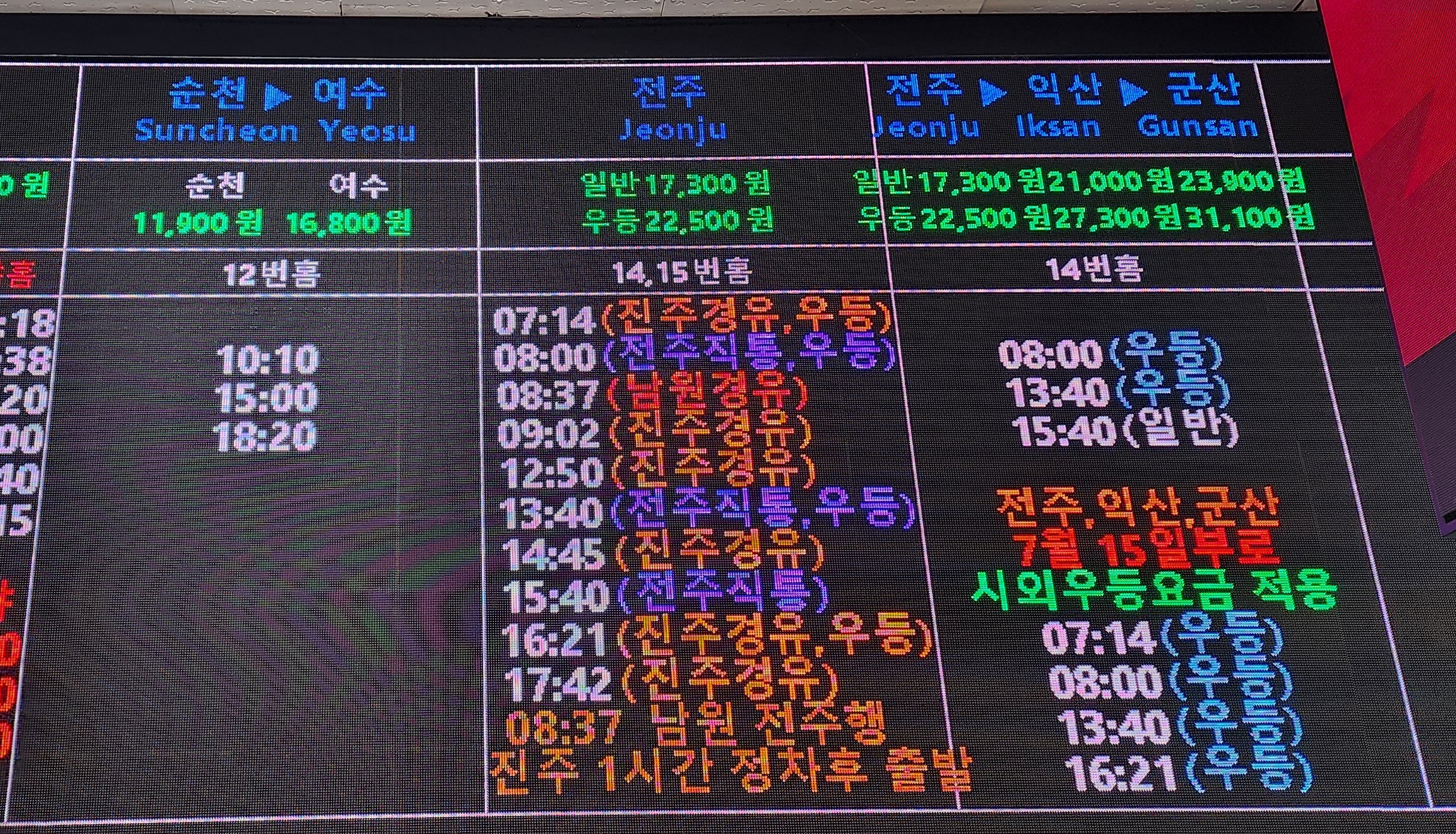 마산 출발 순천, 여수, 전주, 익산, 군산 방면.