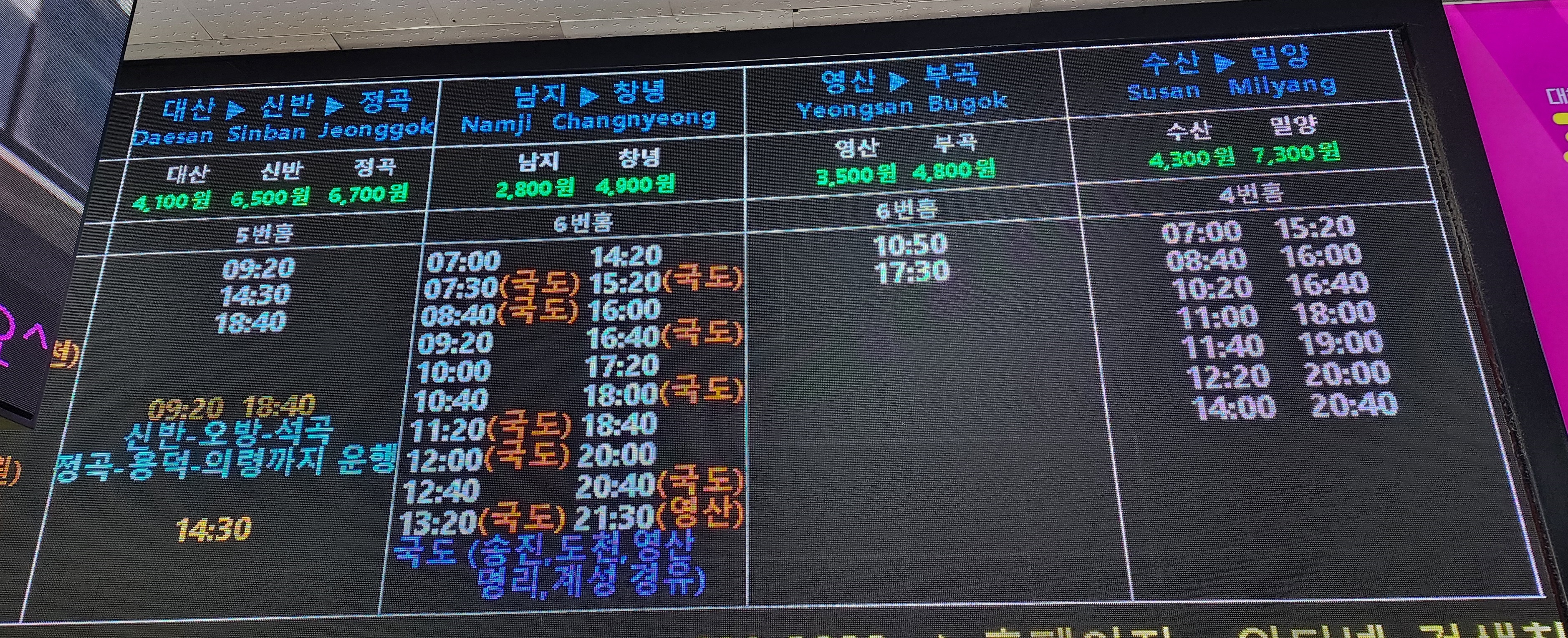 마산 출발 대산, 신반, 정곡, 남지, 창녕, 영산, 부곡, 수산, 밀양 방면.