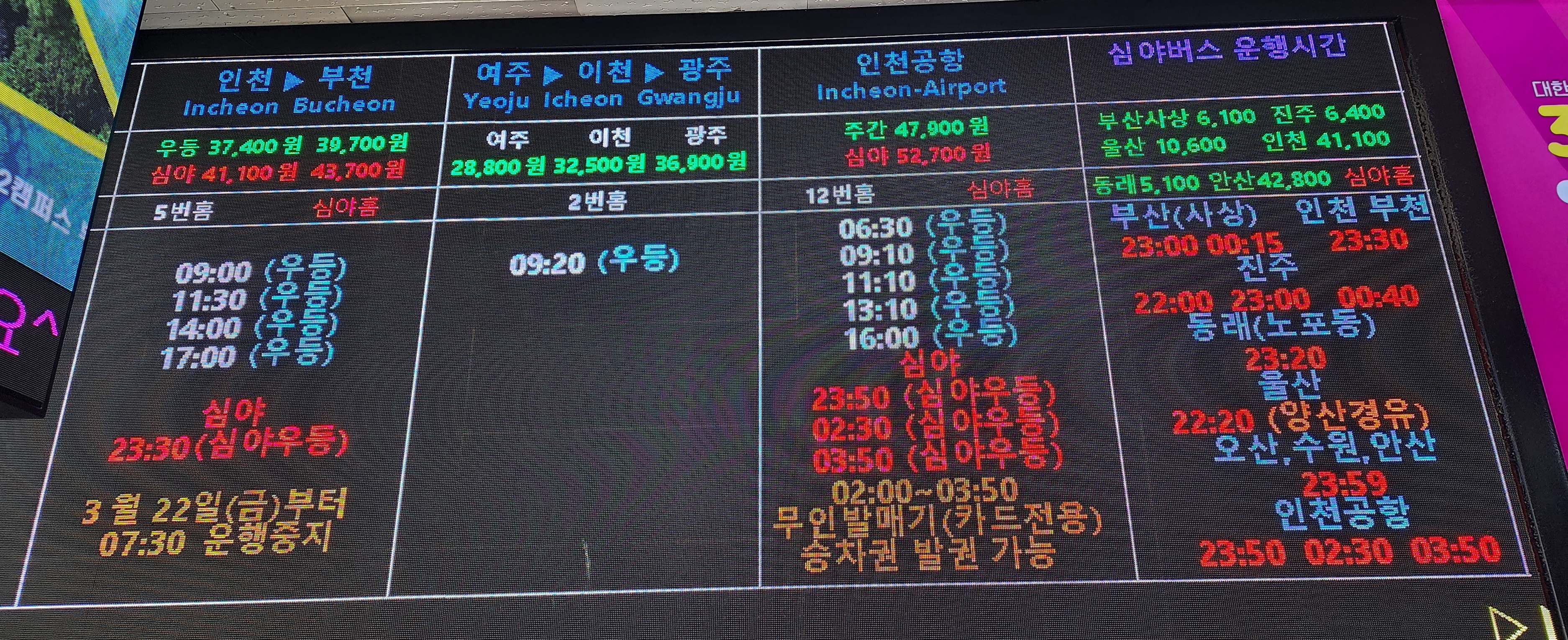마산 출발 인천, 부천, 여주, 이천, 광주, 인천공항, 심야버스 시간표