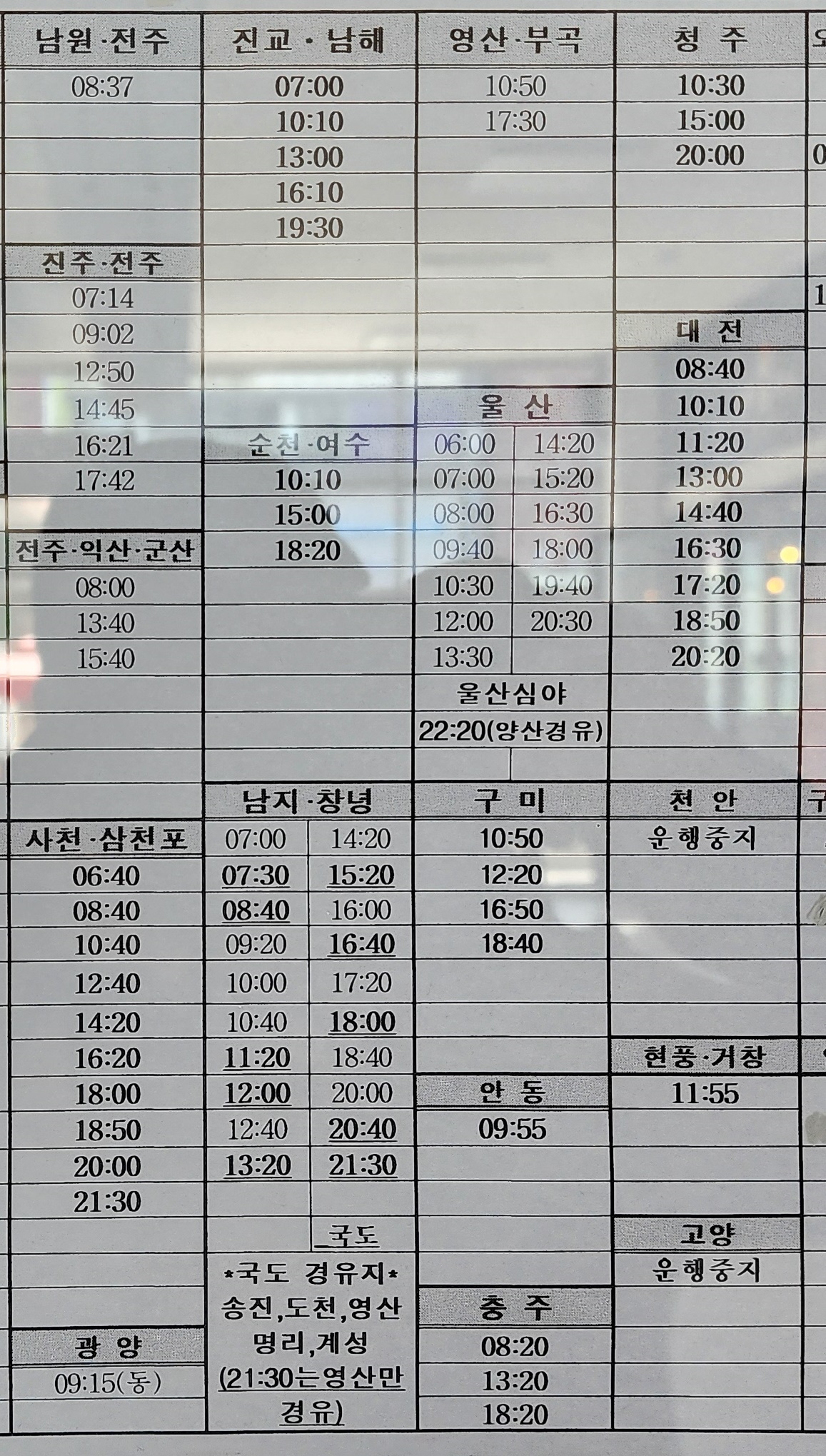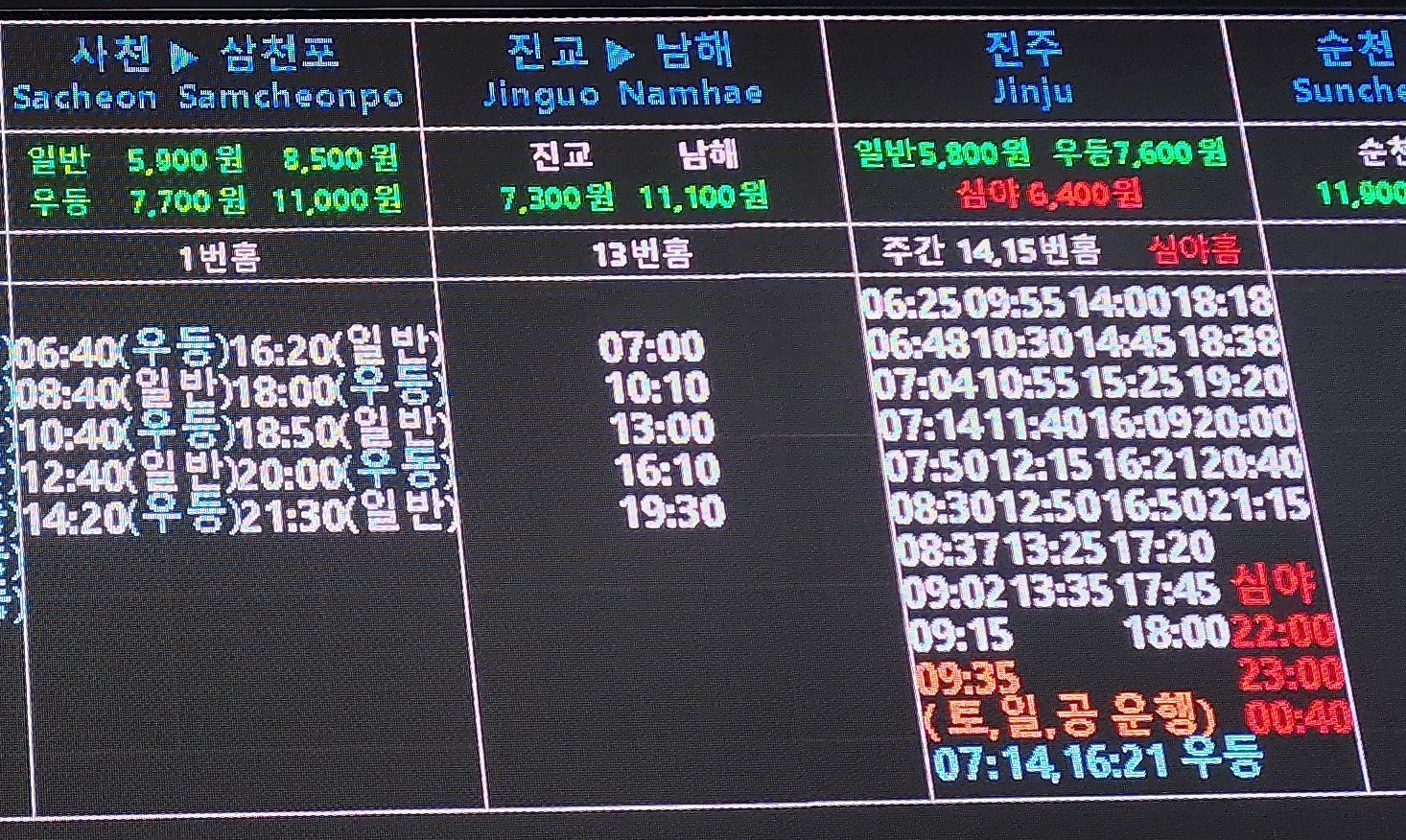 마산 출발 사천, 삼천포, 진교, 남해. 진주 방면.