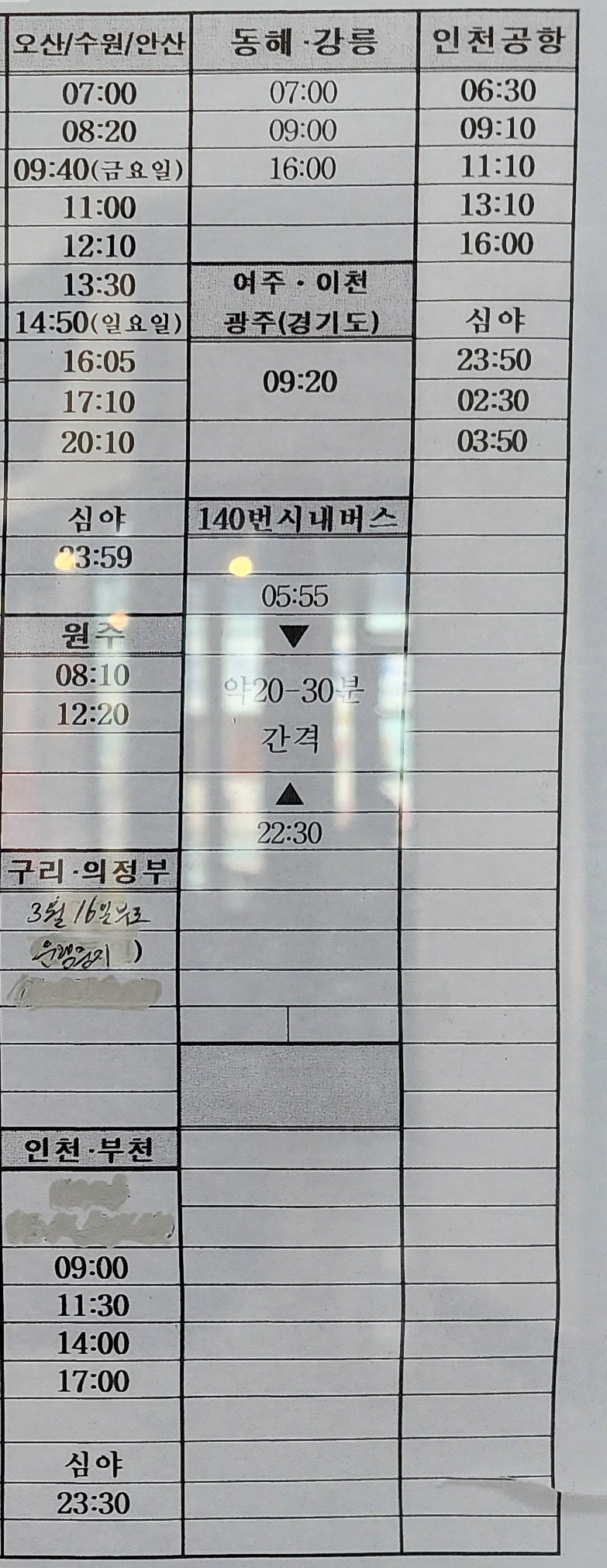 마산 출발 구리, 의정부, 오산, 수원, 안산, 동해, 강릉 방면.